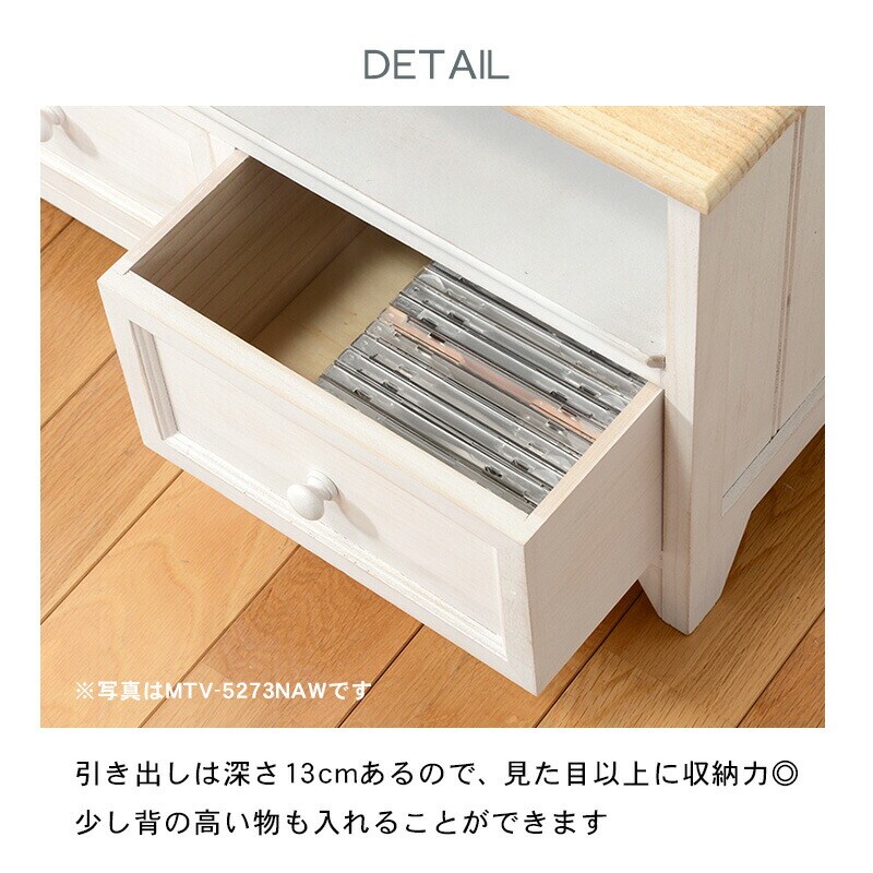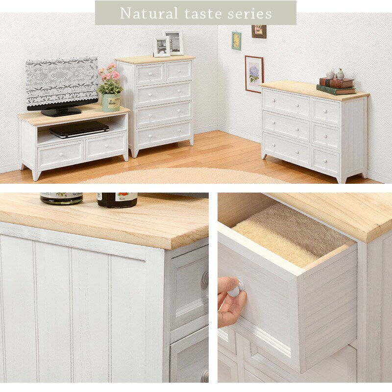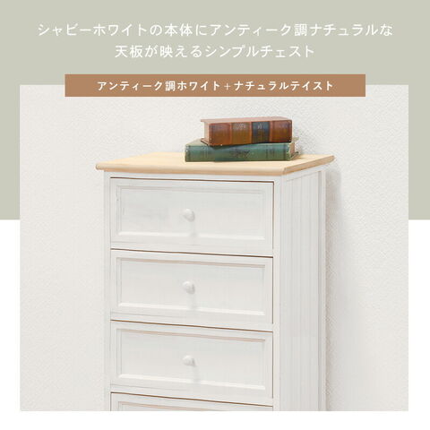 シャビーホワイトの本体にアンティーク調ナチュラルな天板が映える、シンプルチェスト。