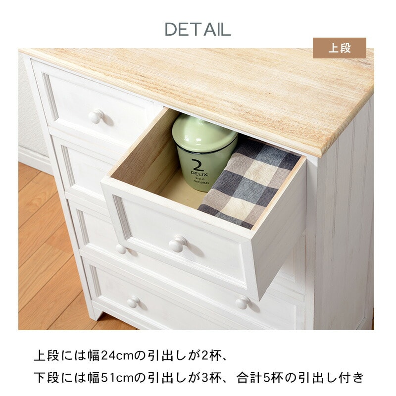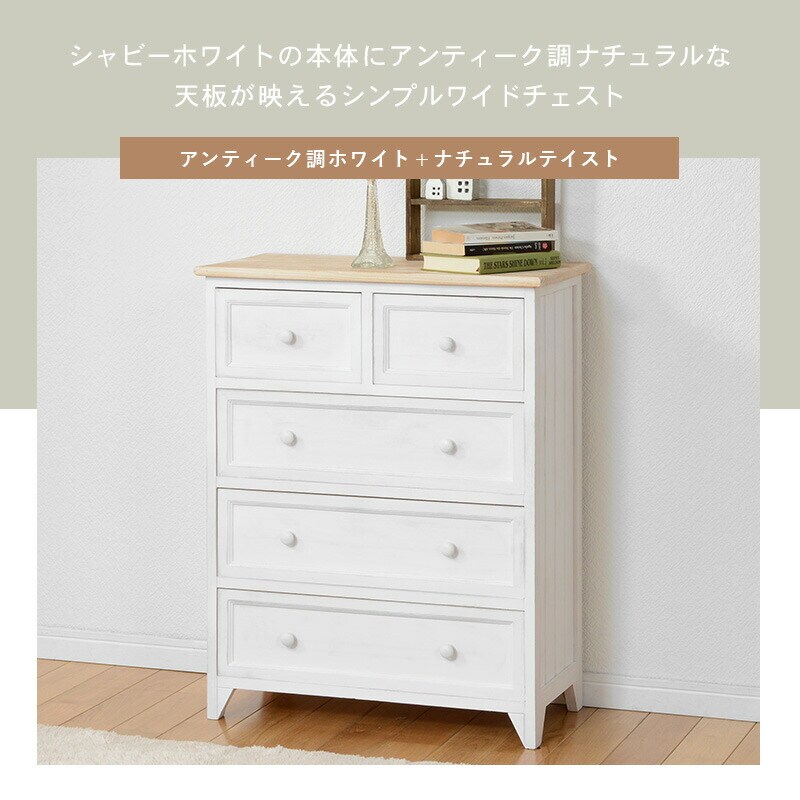 シャビーホワイトの本体にアンティーク調ナチュラルな天板が映える、シンプルチェスト。