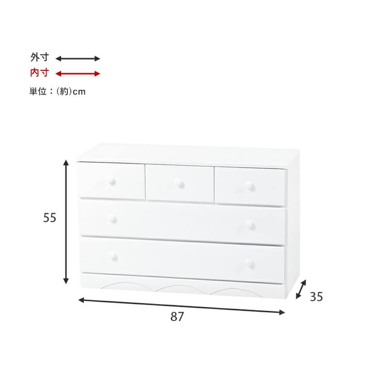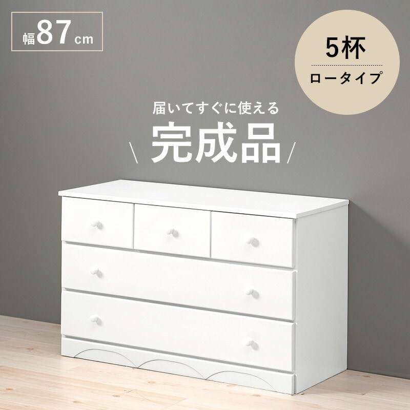 チェスト 白 幅87 引き出し 5杯 完成品 ロータイプ 奥行35 高さ55 天然木 ホワイト モノトーン 箪笥 タンス 衣類収納 韓国インテリア おしゃれ【送料無料】