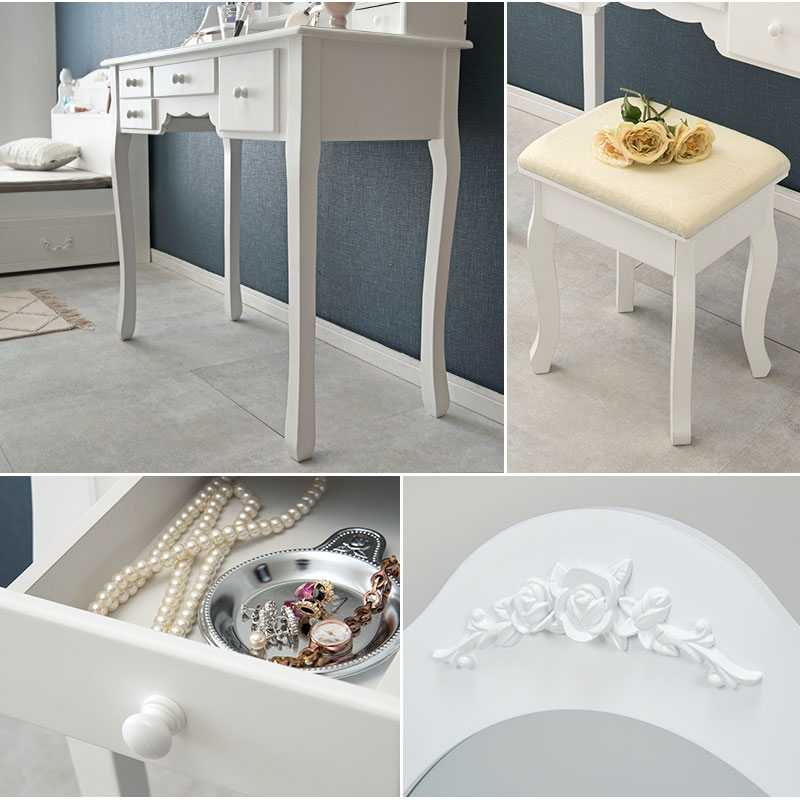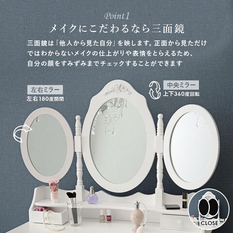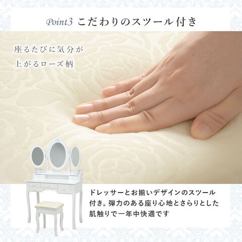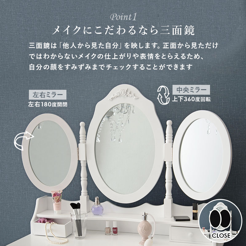 ドレッサー 三面鏡タイプ 幅90cm スツール付き オーバル 丸形 可愛い かわいい 姫系 おしゃれ 白 ホワイト 収納 椅子 チェア スツール セット エレガント【送料無料】