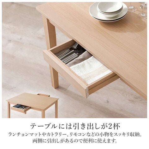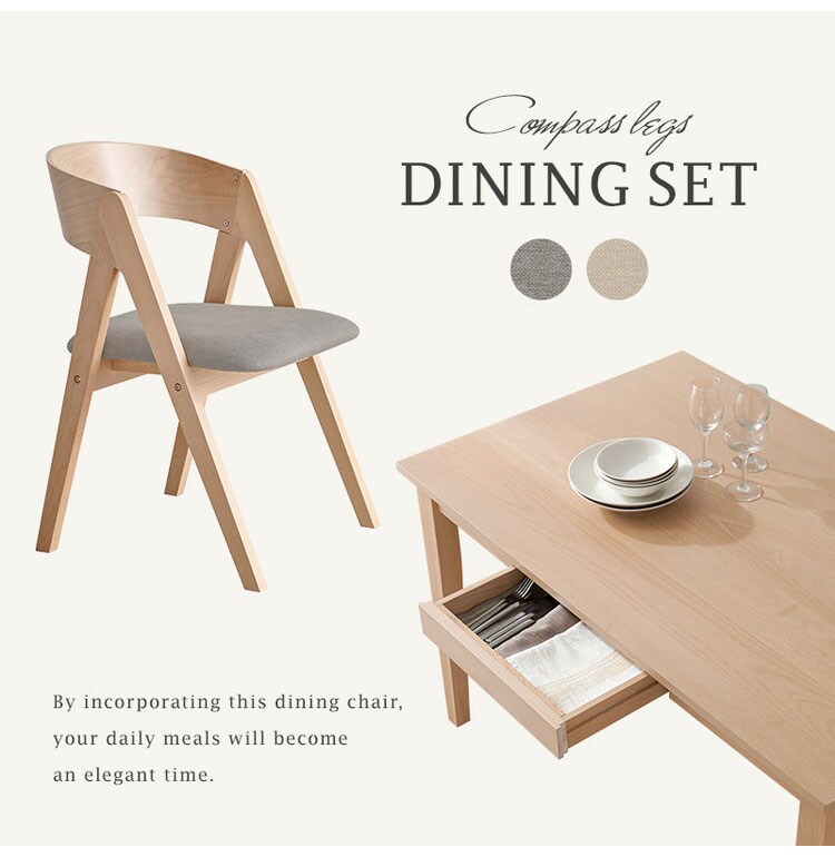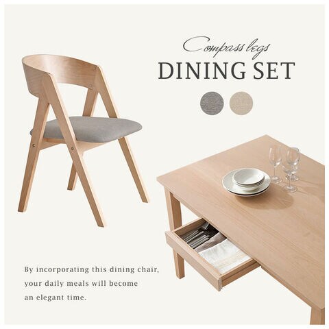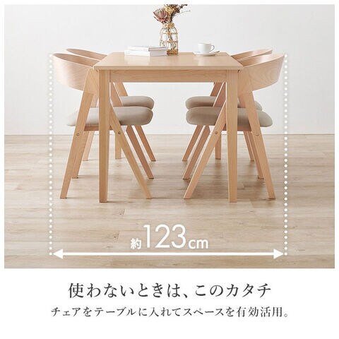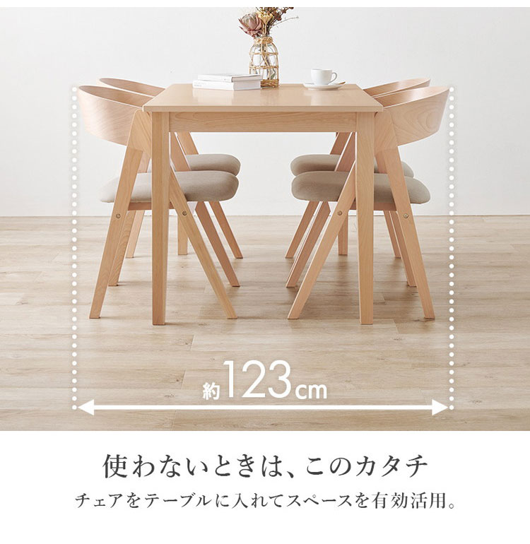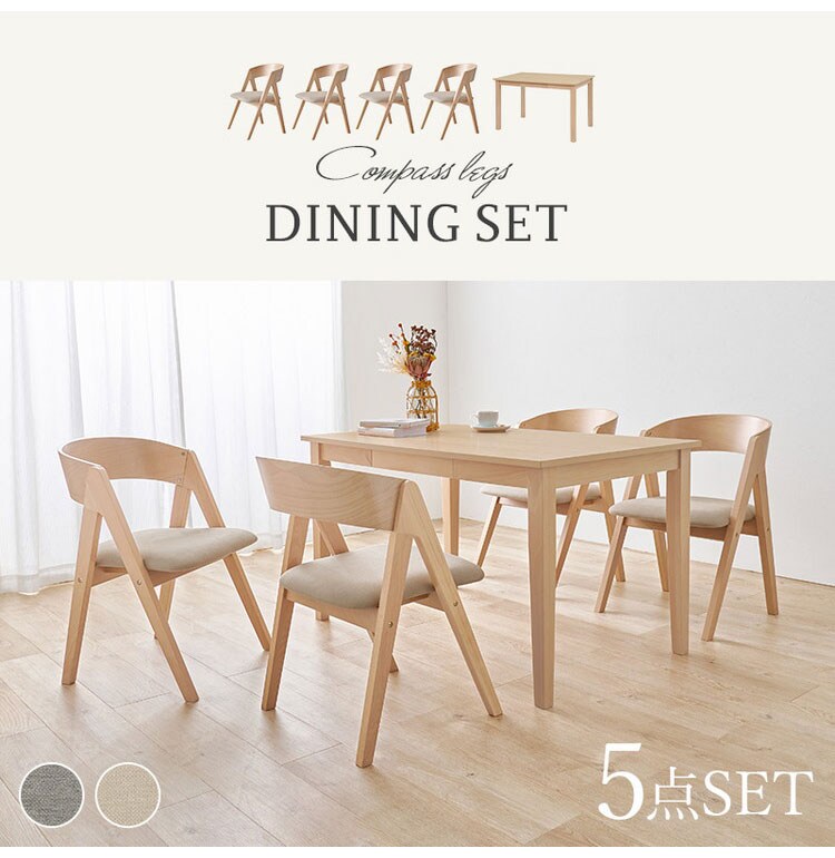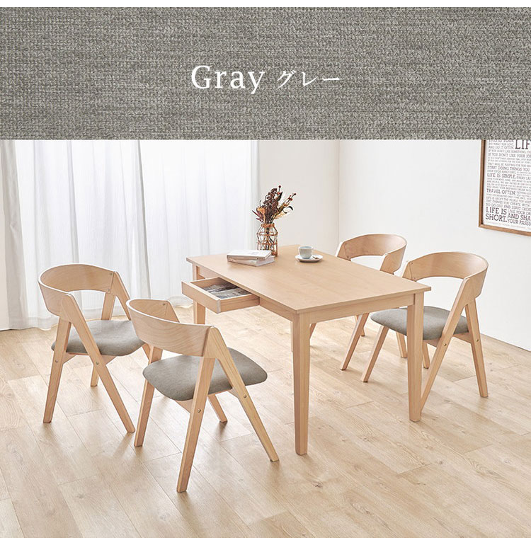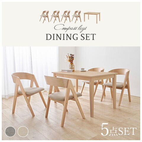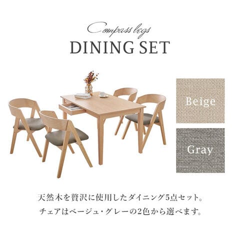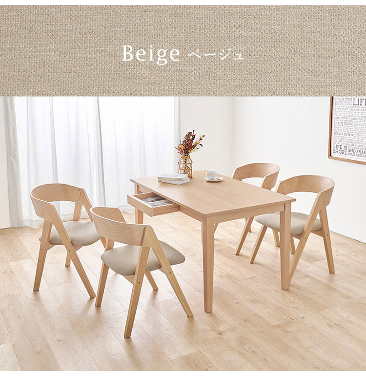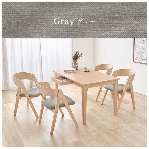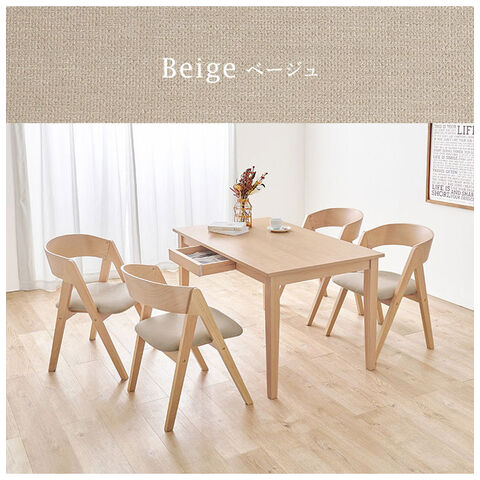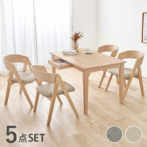 天然木を贅沢に使用したダイニング5点セット。直線と曲線の調和のとれたシルエットがダイニング空間を北欧モダンな雰囲気に。テーブルは便利な引き出し付き。