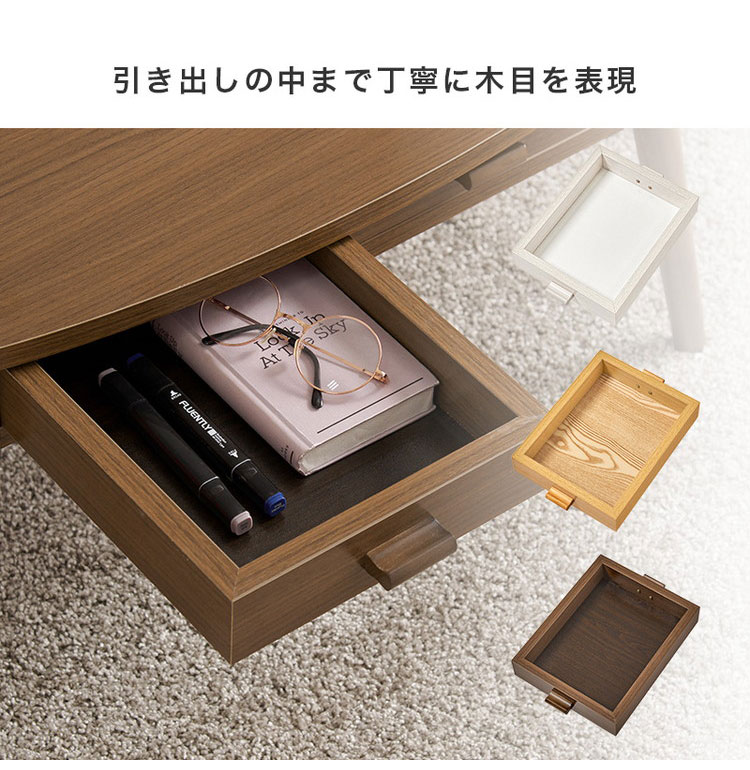 前後どちらからも収納できる両面引出付き。ワンルームにも置きやすいコンパクトサイズのセンターテーブルです。