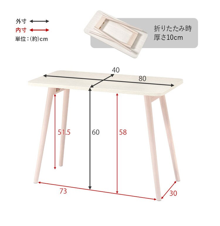 天板:合成樹脂化粧繊維(メラミン)、脚部:天然木(樺材)