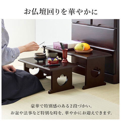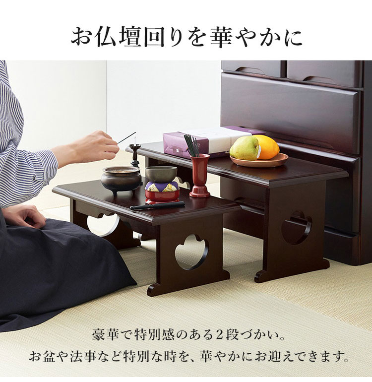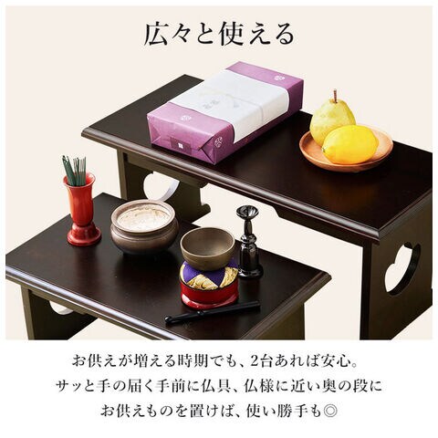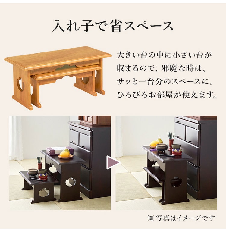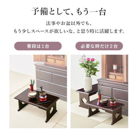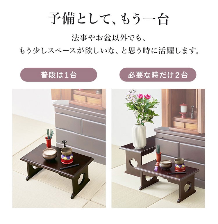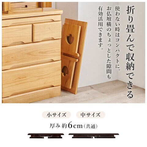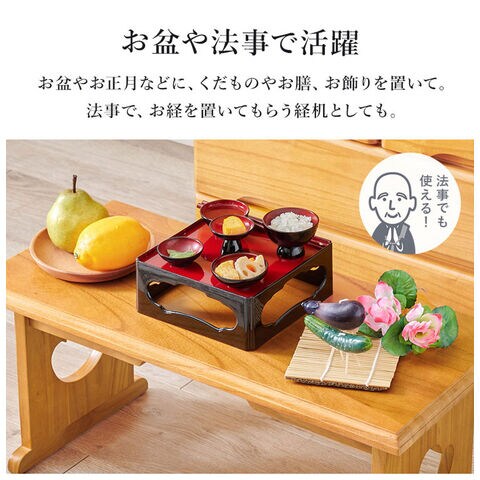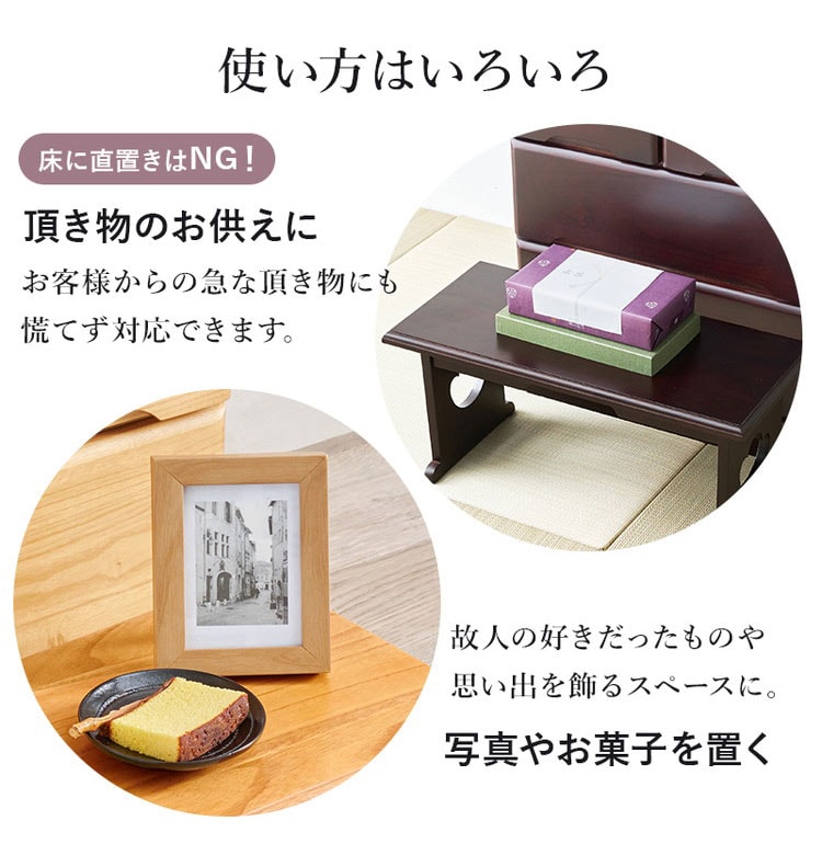 コンパクトに収納できる折り畳み式。日常使いの仏具を置いたり、軽くて持ち運びやすいのでお供え物を頂いた時などにサッ広げたりして使えます。