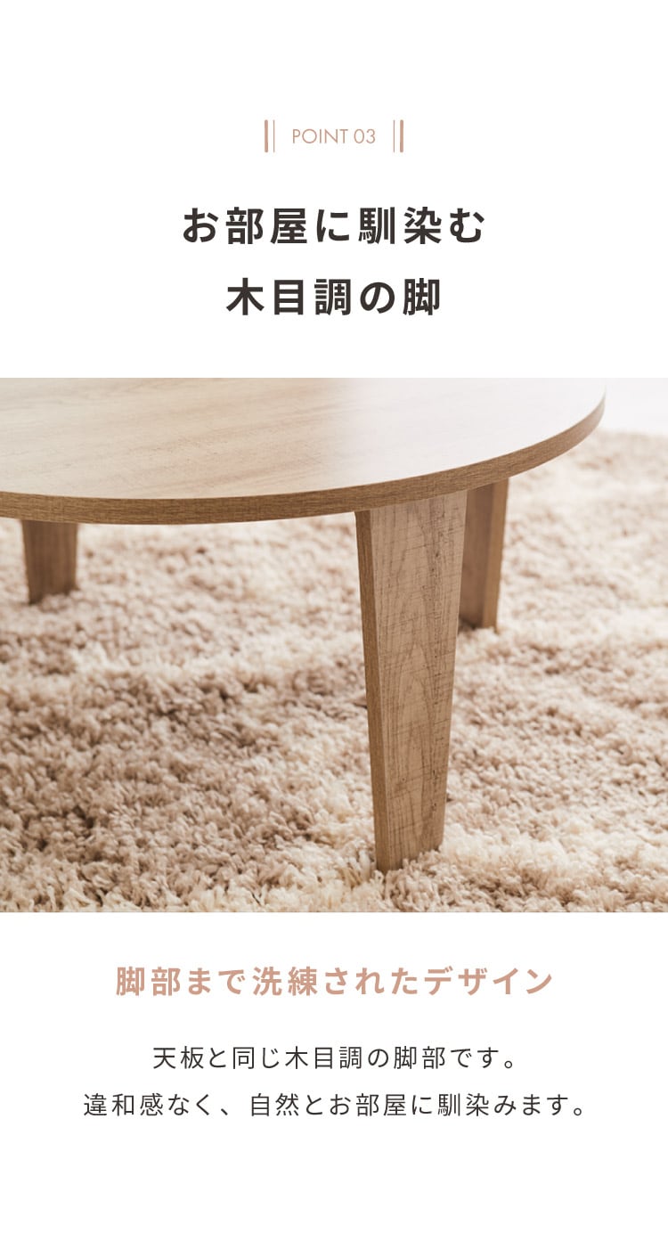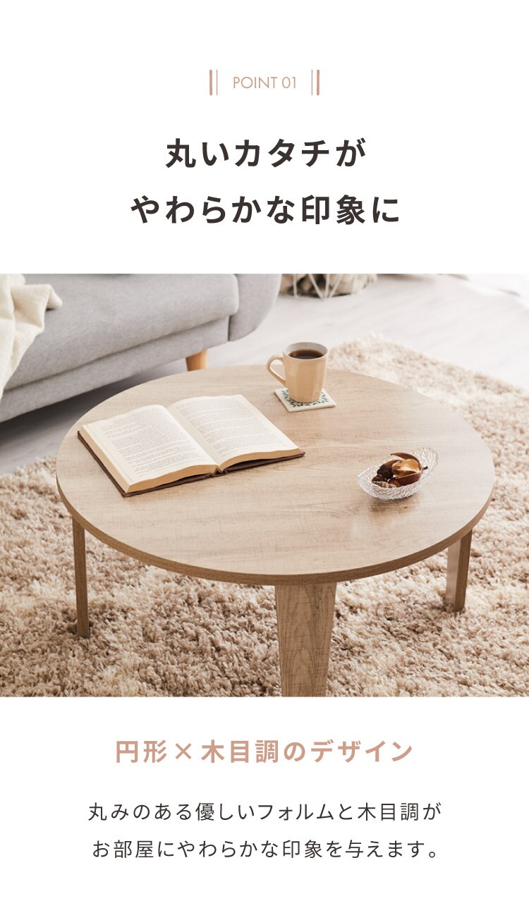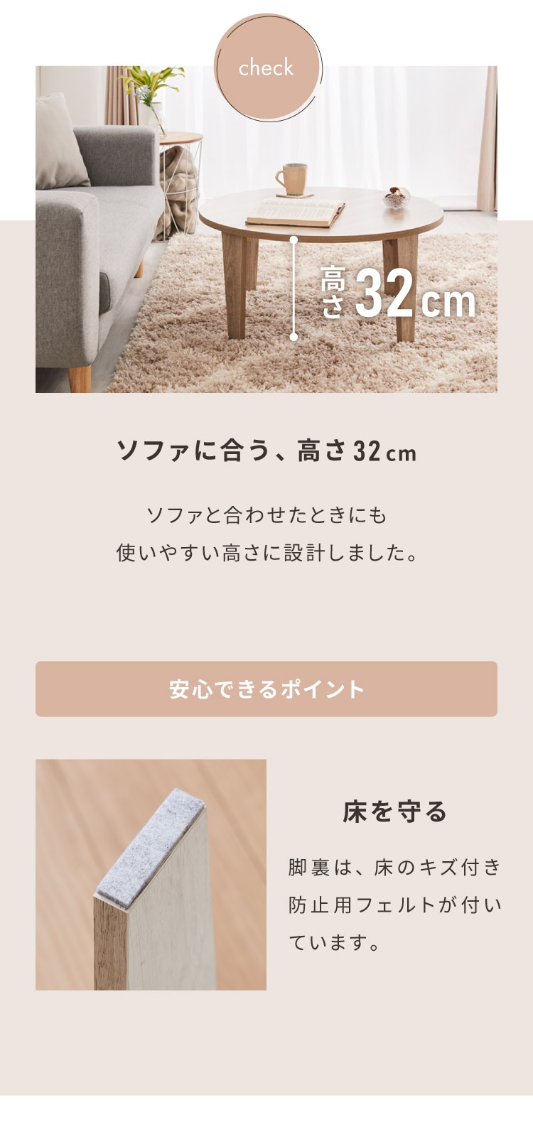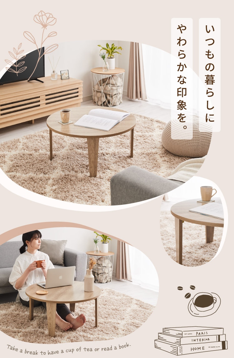 円形の天板にスタイリッシュな脚を組み合わせた、可愛いデザインのローテーブル。