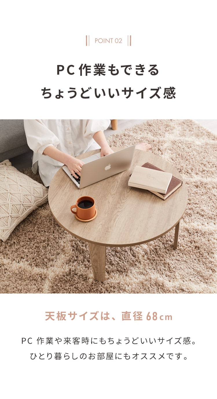 PC作業などにも余裕のある円形ローテーブル。来客時の食事にもちょうど良いサイズです。