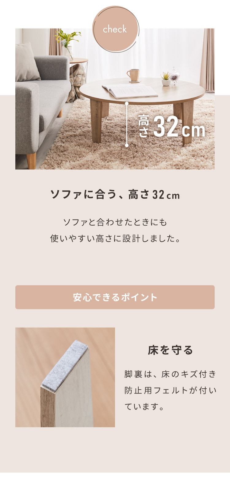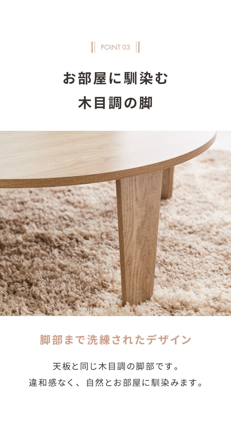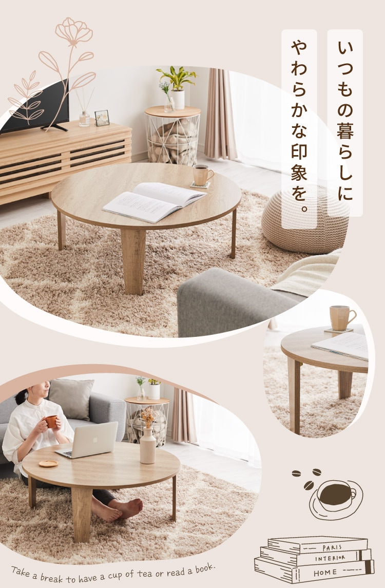 円形の天板にスタイリッシュな脚を組み合わせた、可愛いデザインのローテーブル。