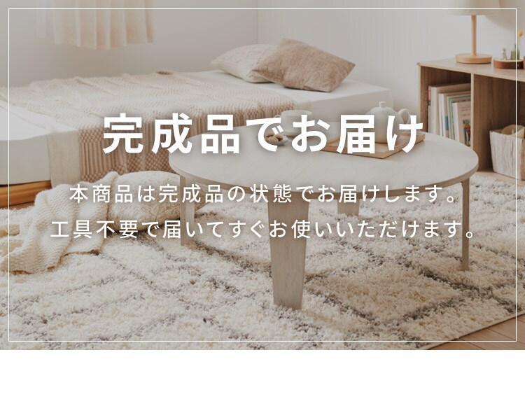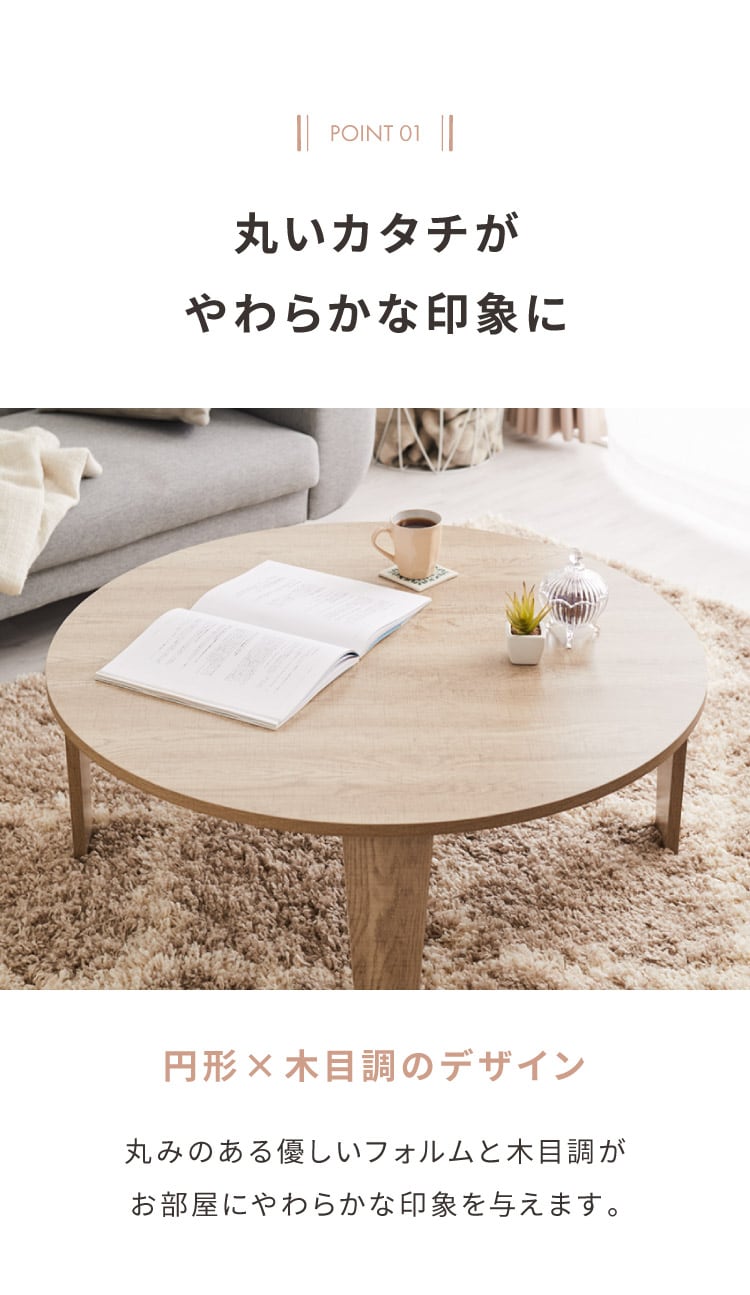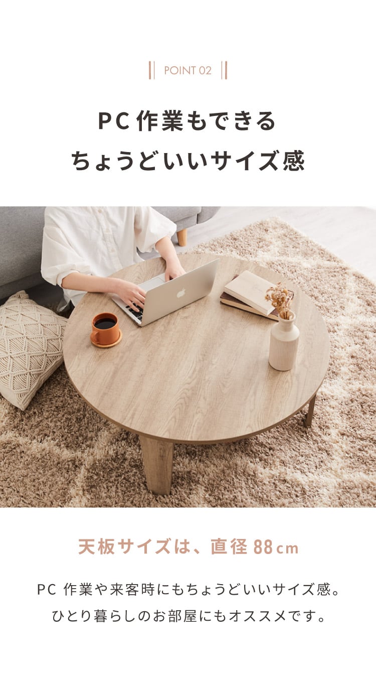 PC作業などにも余裕のある円形ローテーブル。来客時の食事にもちょうど良いサイズです。