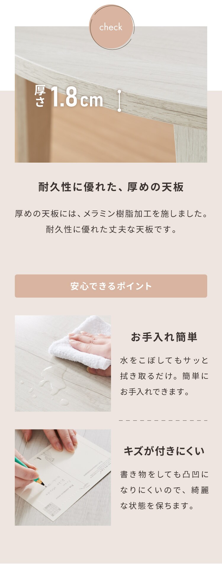 1.8cm厚のしっかりとした天板。メラミン樹脂加工を施しており、水をこぼしてもサッと拭き取るだけ。書き物をしても凸凹になりにくいです。
