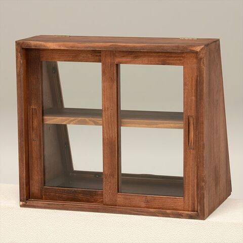 木の風合いが味わい深いカウンター上ガラスケース。表と裏で違う表情を見せる形状でディスプレイとしても活躍します。
