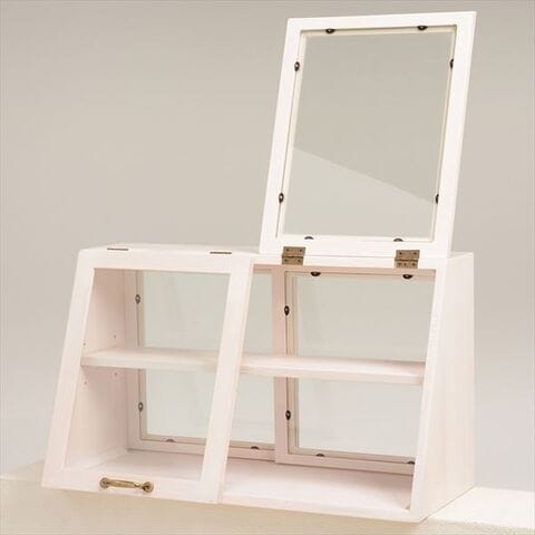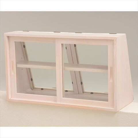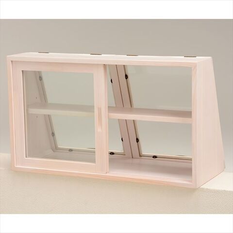 木の風合いが味わい深いカウンター上ガラスケース。表と裏で違う表情を見せる形状でディスプレイとしても活躍します。