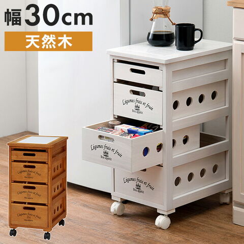 キッチンストッカー 幅30cm 4段 天然木 タイル天板 ワゴン 野菜ストッカー キッチンワゴン すき間収納 隙間収納 キャスター付き キッチン 収納庫 木製 キッチン収納【送料無料】