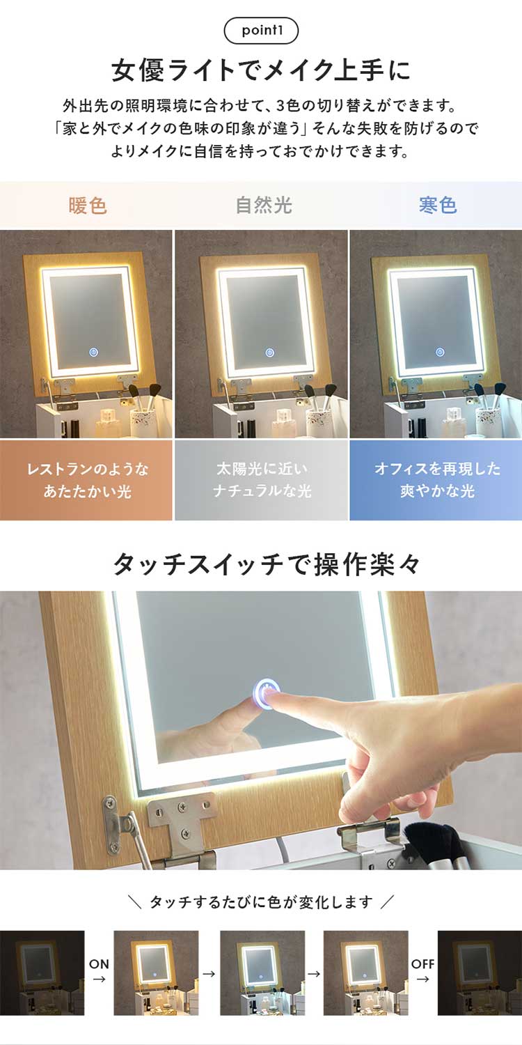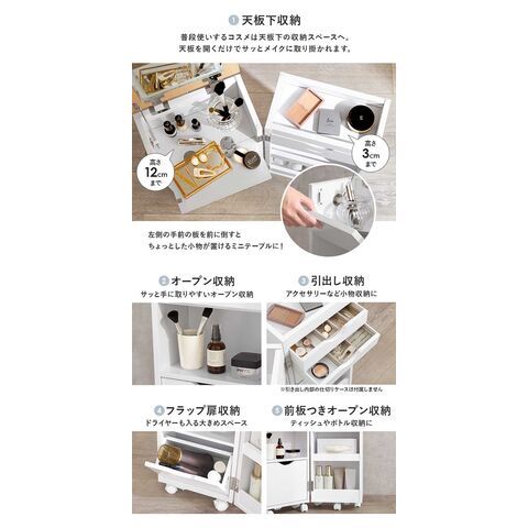 コスメからヘアメイク道具、アクセサリーまで身支度に必要なものを収納できます。