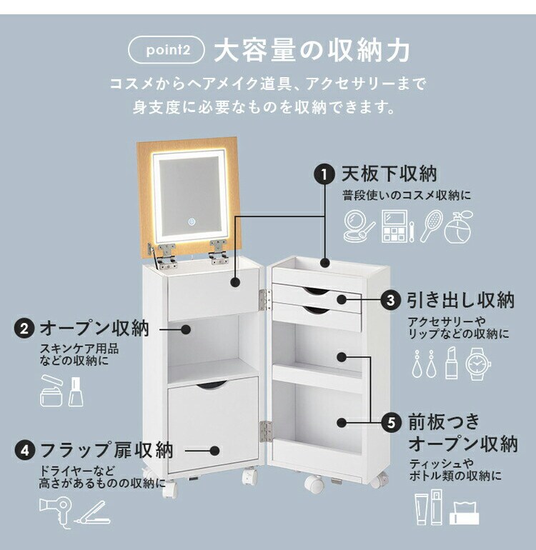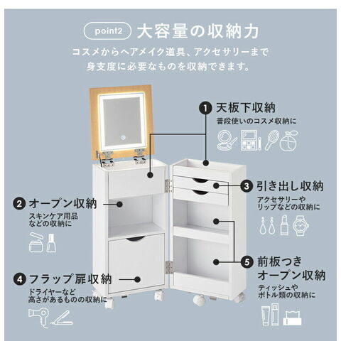LEDライトと可動式ミラーがついた大容量のコスメワゴン。