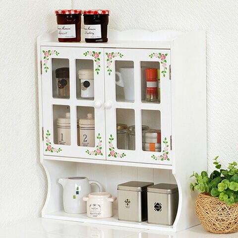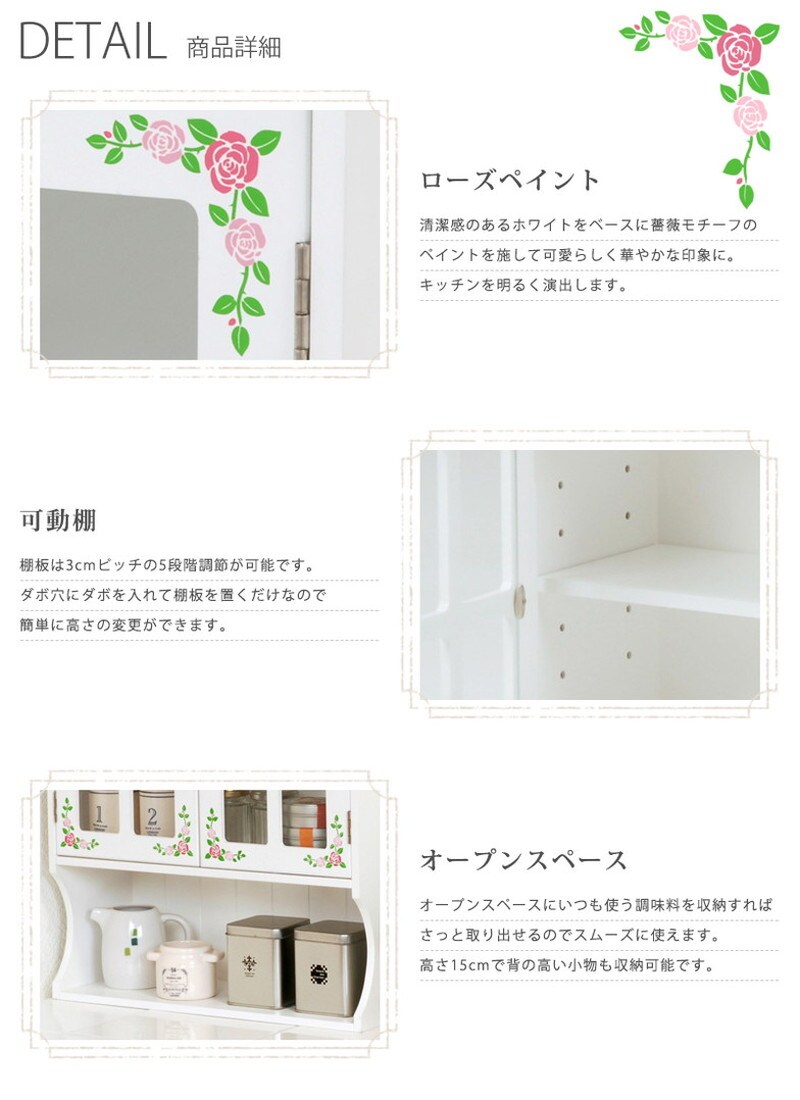 カウンター上収納 スパイスラック ローズ柄 調味料ラック 幅42cm ローズ柄 キッチンラック 収納ラック 木製 キッチン収納 白 ホワイト おしゃれ【送料無料】