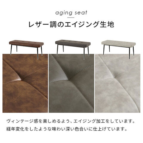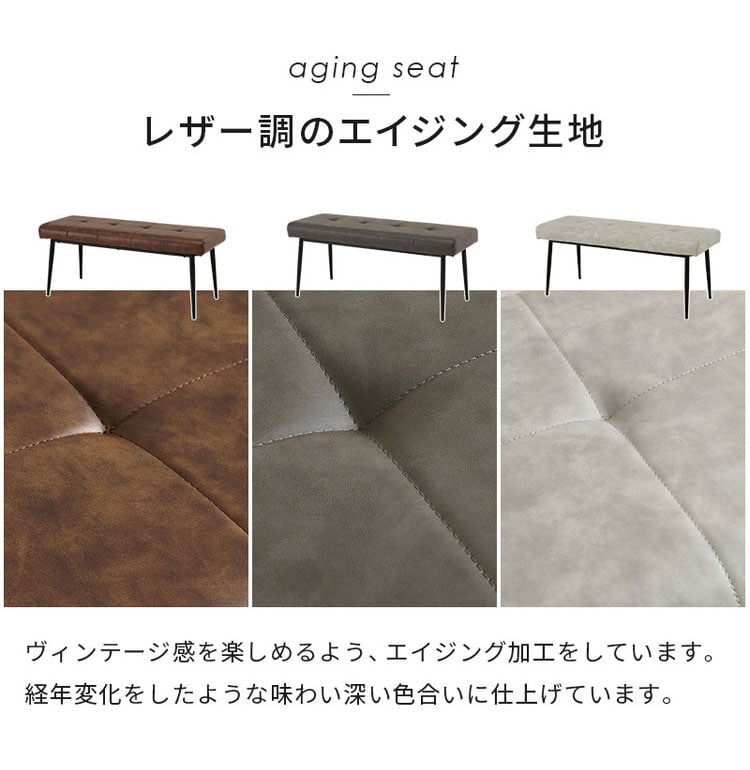 座面の大きめのステッチがアクセントとなるシンプルデザインのダイニングベンチ。張地はヴィンテージ感のあるエイジング加工をした色合いです。