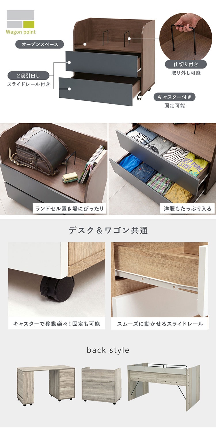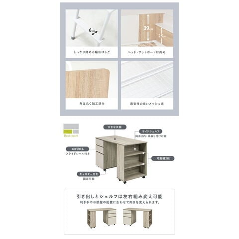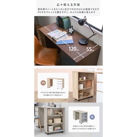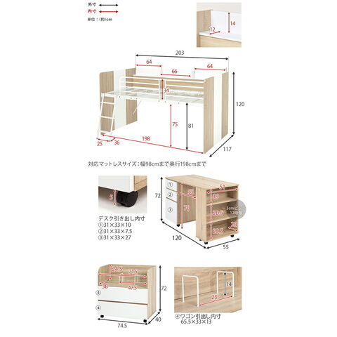 ベッド:(約)幅117×奥行203×高さ120×床面高81cm、デスク:(約)幅120×奥行55×高さ72cm、ワゴン:(約)幅74.5×奥行40×高さ72cm