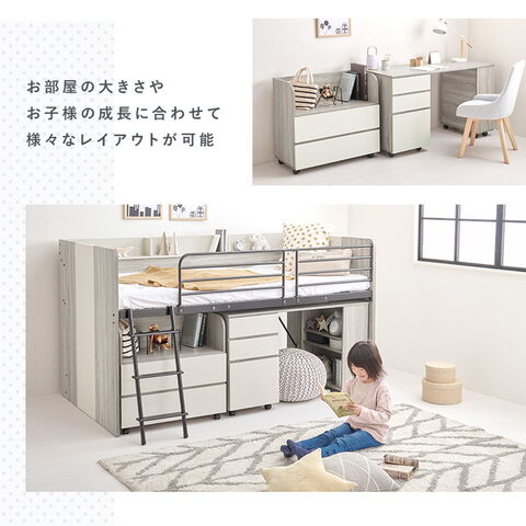 デスク・ワゴンの付いたシステムベッド。ベッド下スペースを有効活用でき、お子様の成長に合わせて様々なレイアウトが可能です。