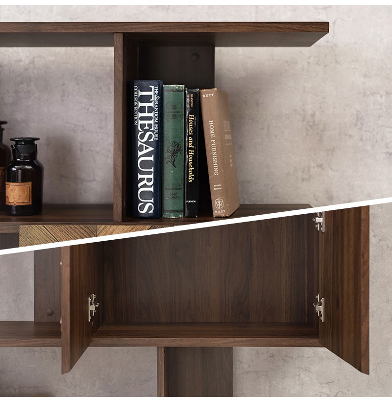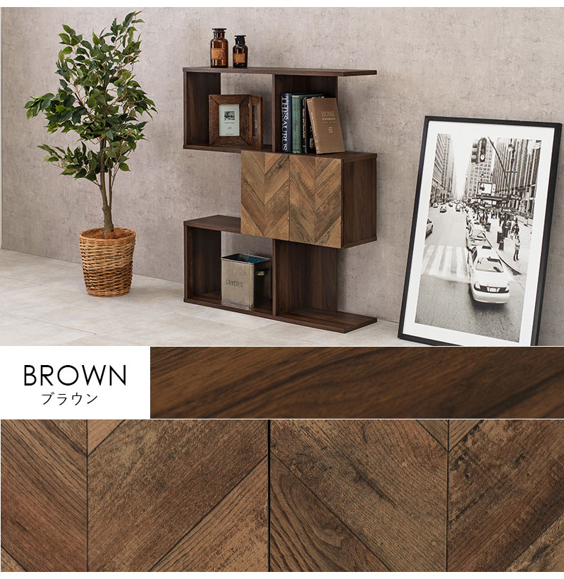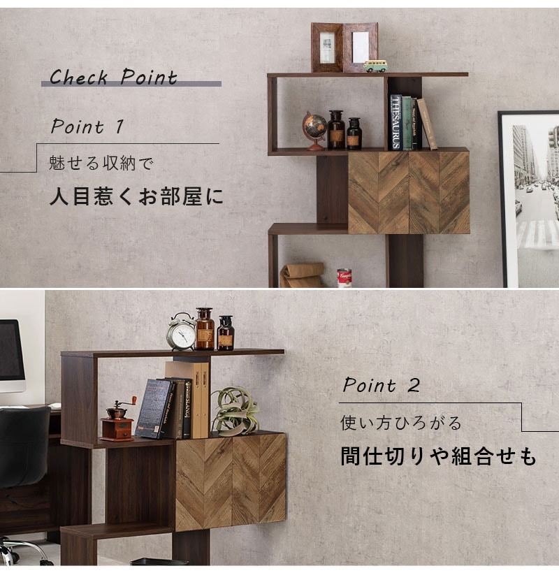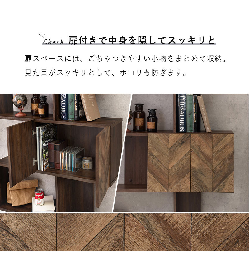 扉の木目調のシートがアクセントになり、収納の幅も広がるディスプレイラック