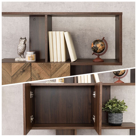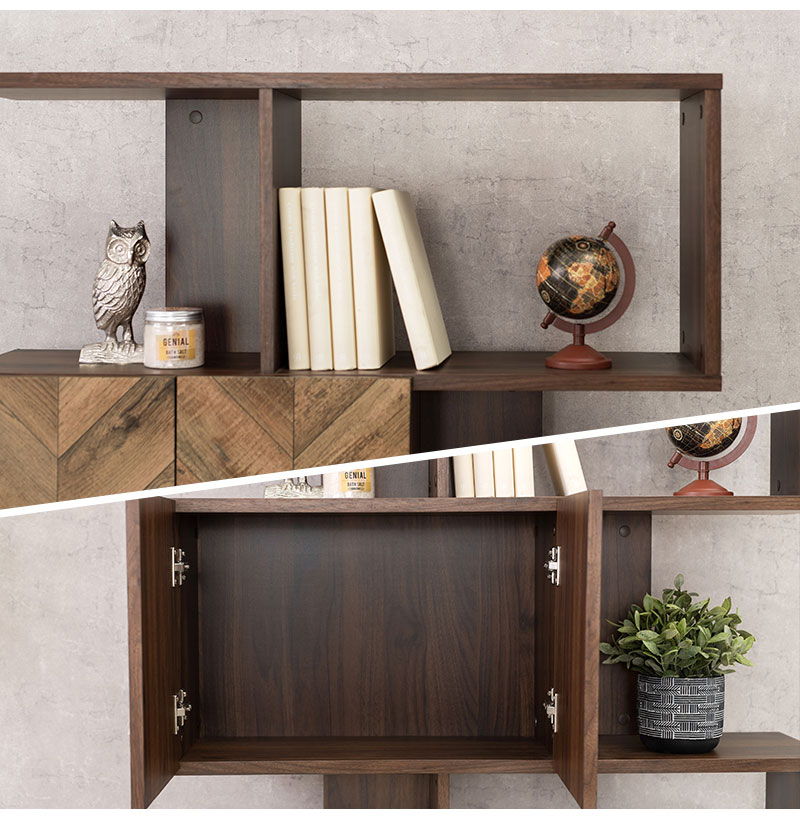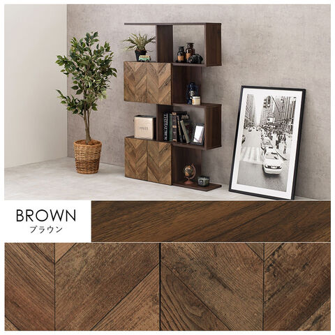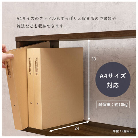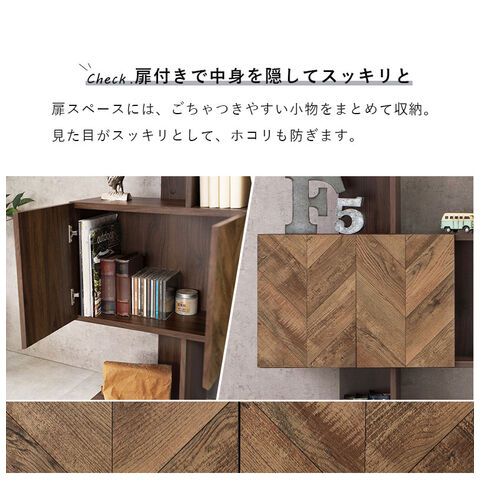 扉の木目調のシートがアクセントになり、収納の幅も広がるディスプレイラック