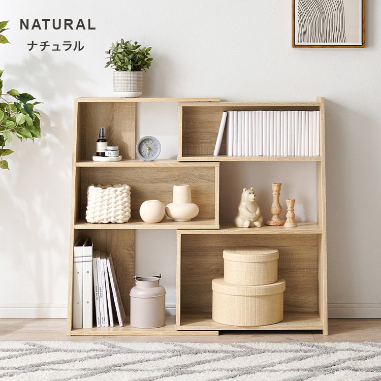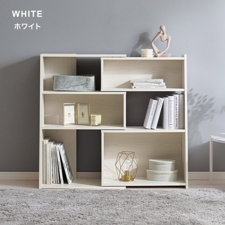 お部屋や収納するものによって幅を変えられる伸縮オープンラック。下の段ほど奥行きが広く使いやすいスタイリッシュなフォルム。