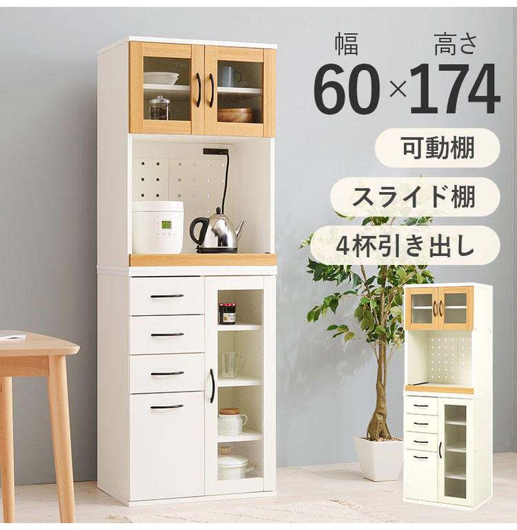 食器棚 キャビネット 幅60cm Dタイプ 大容量 スライド棚 可動棚 扉収納 引出し収納 スリム キッチンラック 棚 北欧 おしゃれ キッチンボード【送料無料】