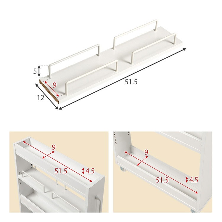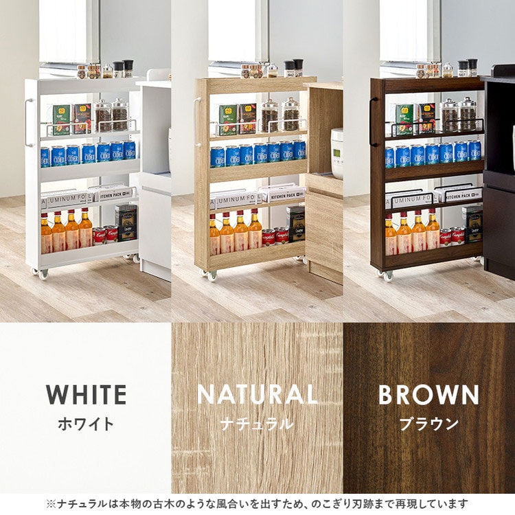 わずかな隙間に収まるスリムなワゴンラック。オープンタイプなので必要な時に取り出しやすく、キッチンやランドリースペースで活躍します。