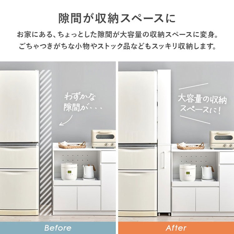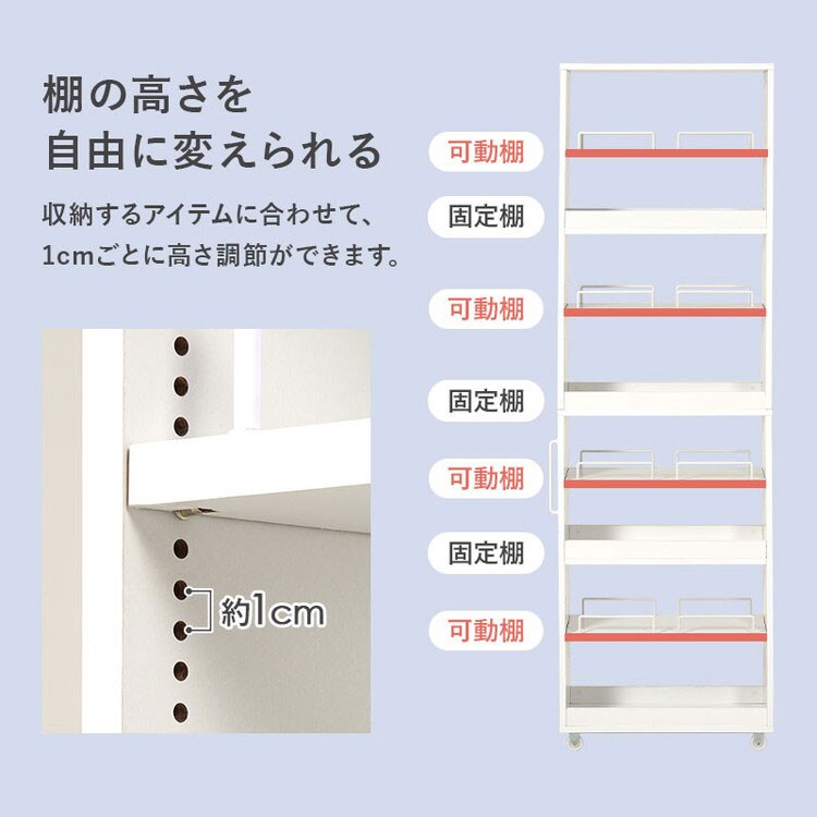 わずかな隙間に収まるスリムなワゴンラック。オープンタイプなので必要な時に取り出しやすく、背が高いので調味料やスパイスなど大量収納可能です。