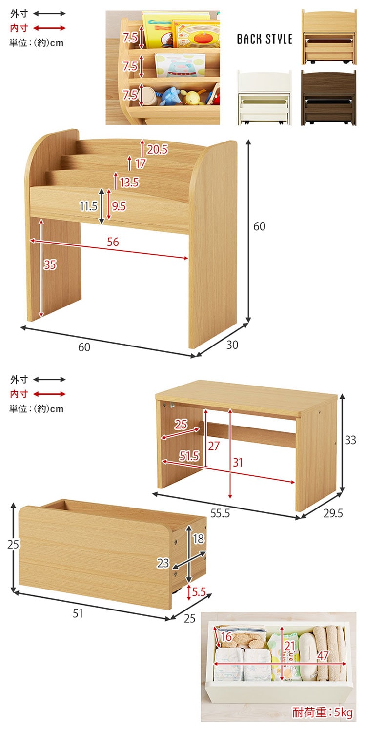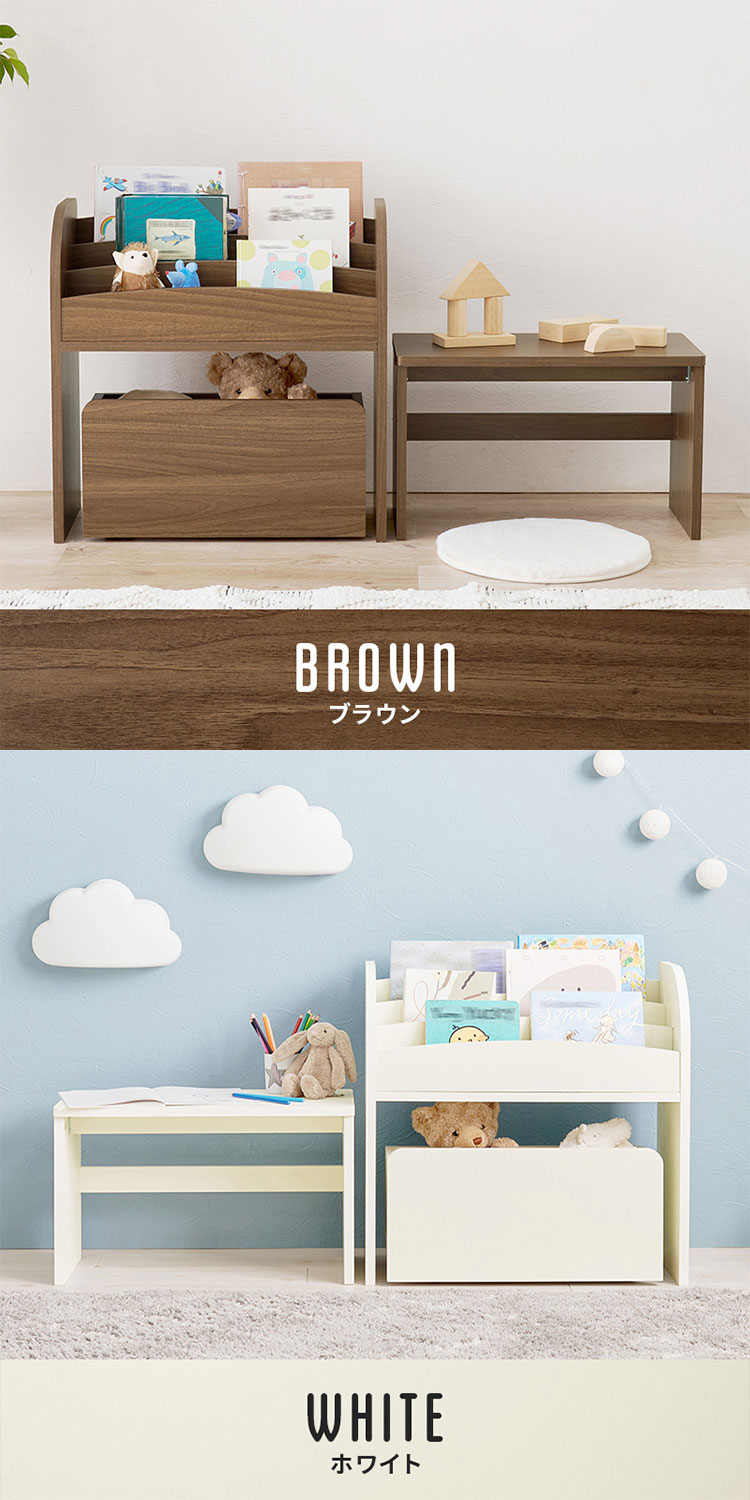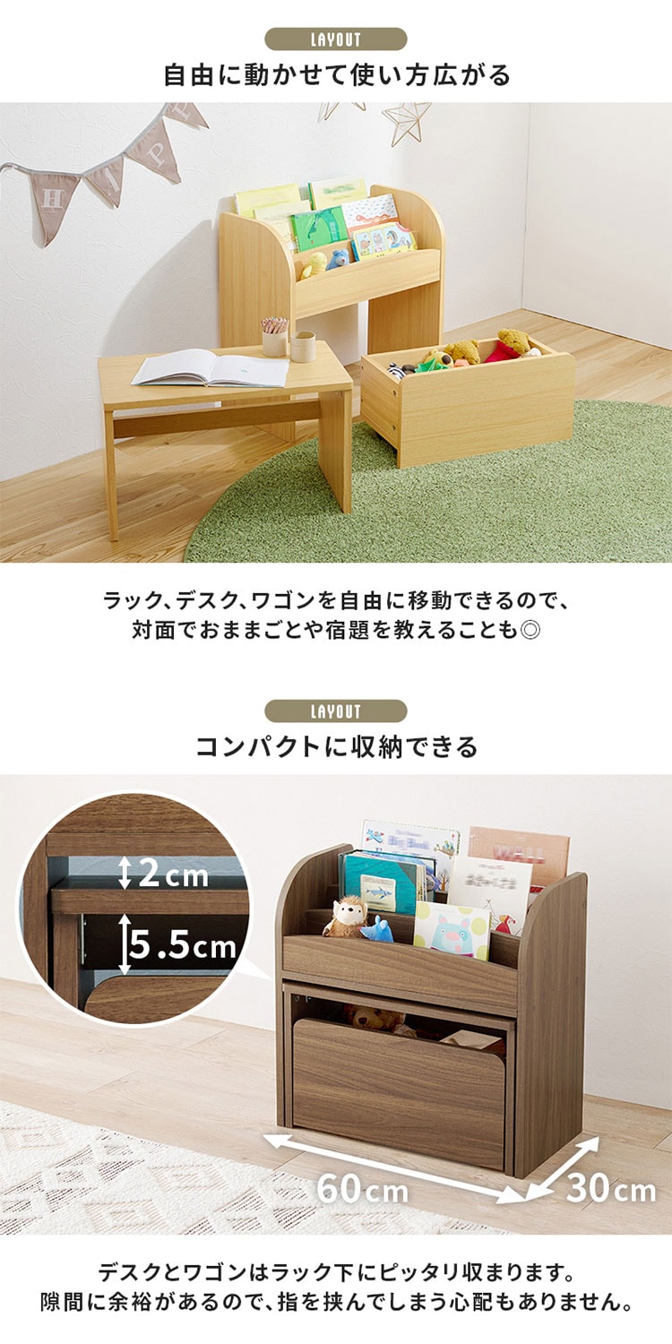 表紙が見やすくオープンタイプなので出し入れしやすい絵本・マガジンラック。コンパクトにまとまるミニデスクと収納に便利なワゴンが付いた3点セット。