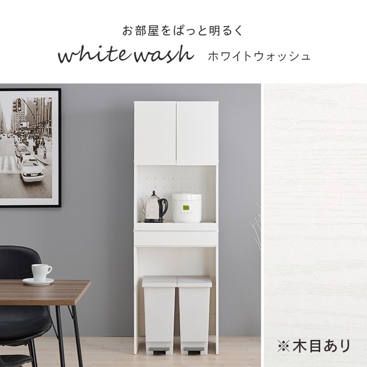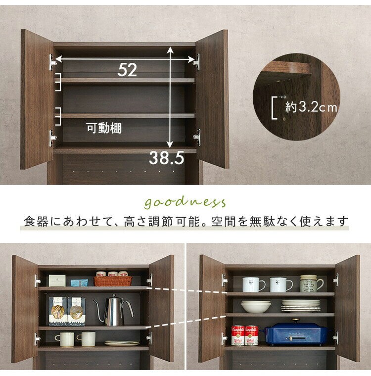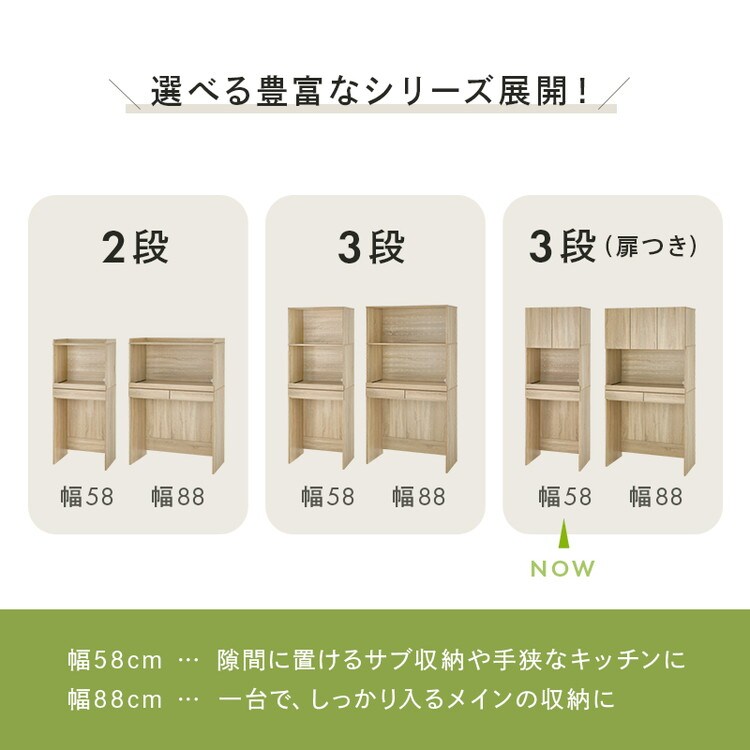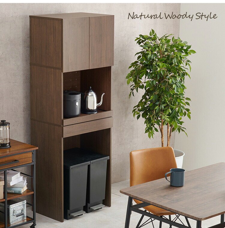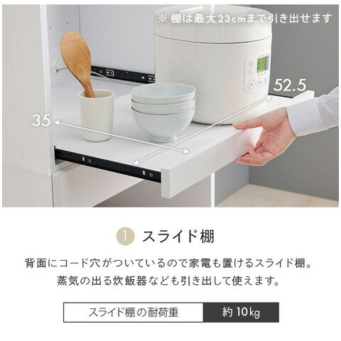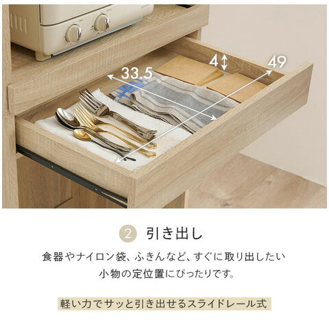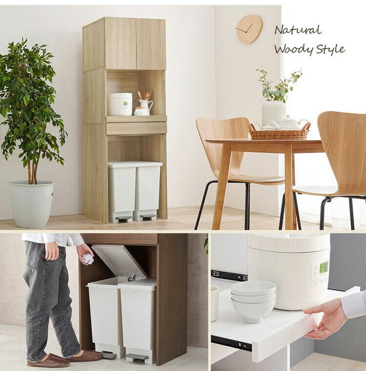 オープン部分と扉収納を合わせた多機能タイプでキッチンスペースを有効活用可能。引出しやスライド棚付きでキッチン家電も使いやすい。