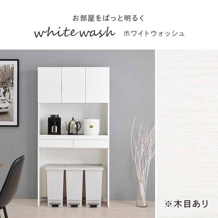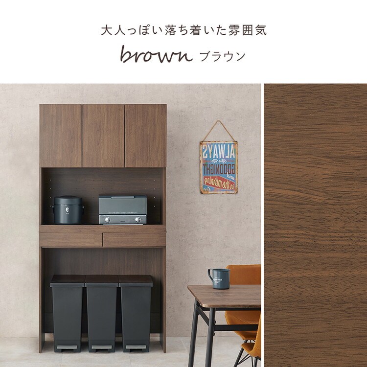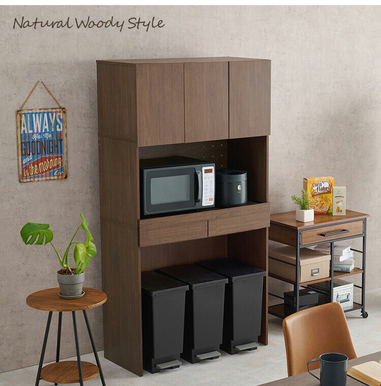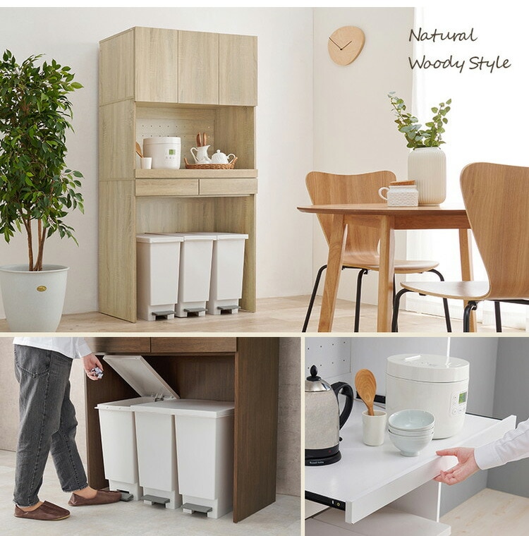 オープン部分と扉収納を合わせた多機能タイプでキッチンスペースを有効活用可能。引出しやスライド棚付きでキッチン家電も使いやすい。