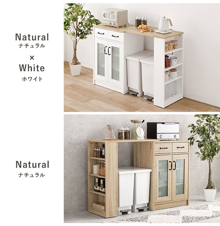 カントリー調 伸縮キッチンカウンター 2点セット 幅73.5~121.5 扉収納 キャビネット 食器棚 可愛い かわいい 北欧 おしゃれ アンティーク調 キッチン収納 棚 ラック ごみ箱上ラック ゴミ箱上ラック【送料無料】