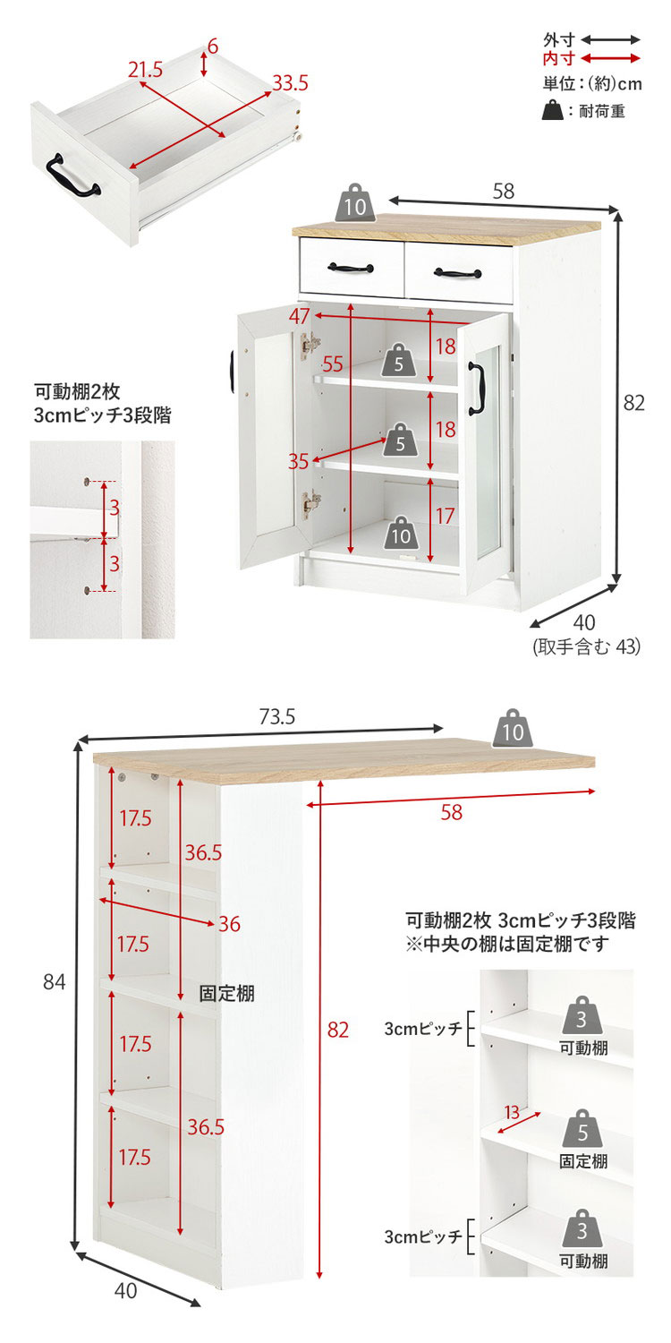 収納スペースに合わせて幅を調整できるカウンターキャビネット。引出し付きで収納しやすく、作業台としても使いやすい高さがポイント。