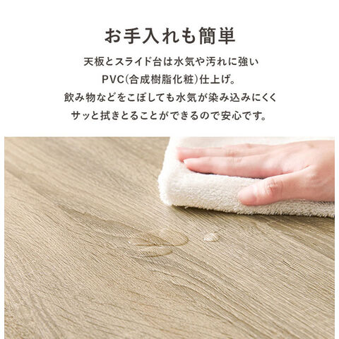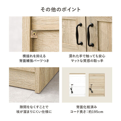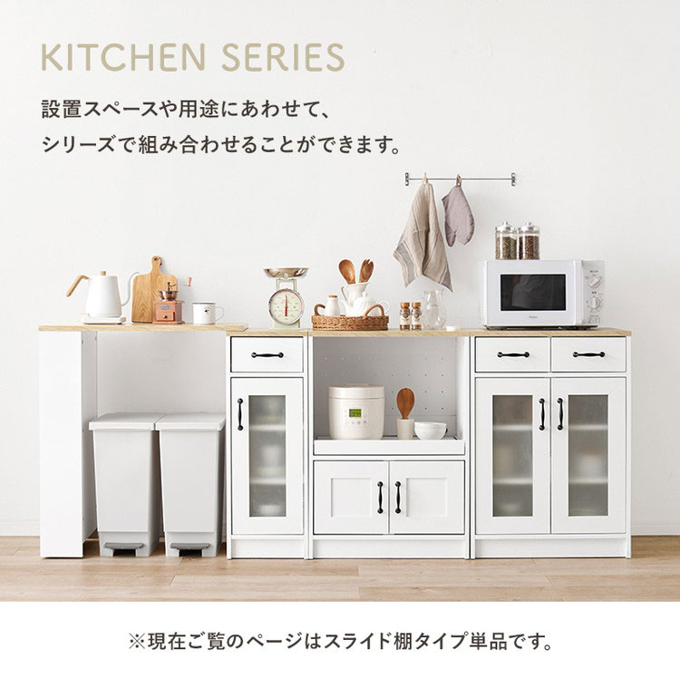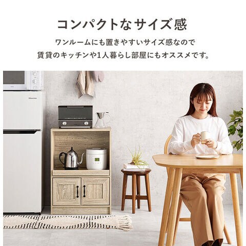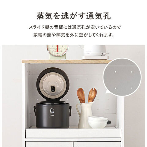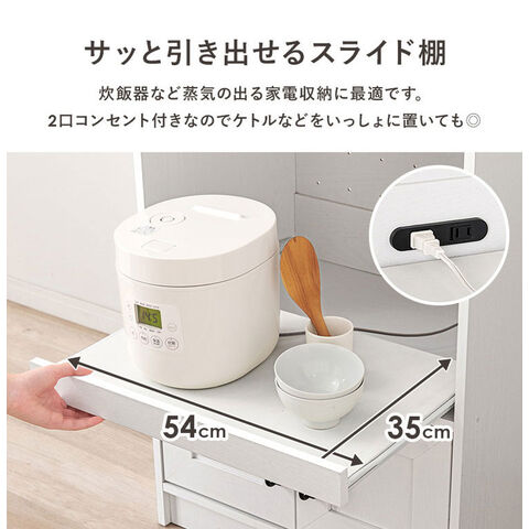 ワンルームにも置きやすいコンパクトサイズのキッチンラック。スライド棚には2口コンセントが付いており、作業台としても使いやすい高さがポイント。
