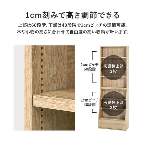 1cmピッチで棚板高さが調節できるハイタイプの大容量本棚。下に行くほど奥行が広くなっており、引出しには日用品の収納もできます。
