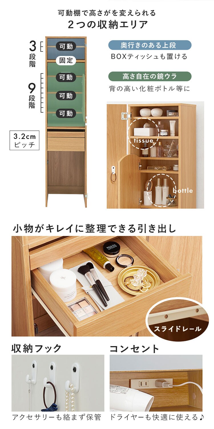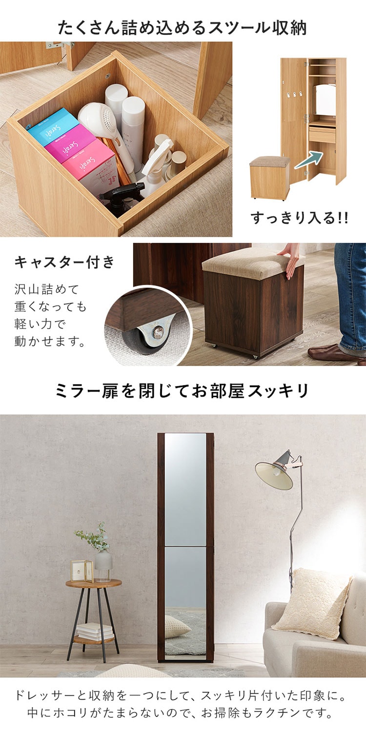 スペースを賢く使えるスリム設計。姿見を開けるとスツール付の大容量収納ドレッサーに。