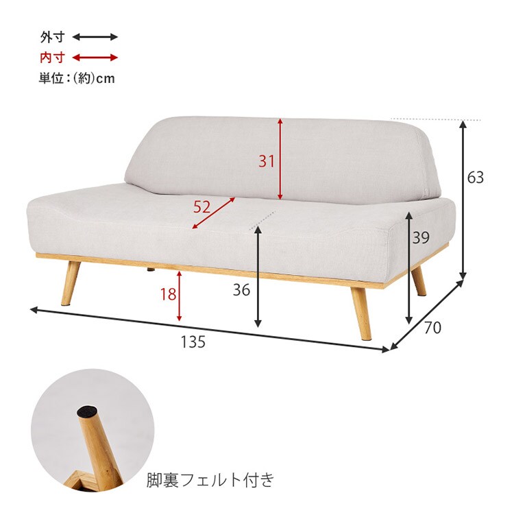 アームレスソファ ごろ寝ソファ ゆったり座面 幅135 奥行ワイド 脚付き 2人掛け 肘無し 2P 北欧 おしゃれ 天然木脚 ローソファー ファブリック 2Pソファ【送料無料】