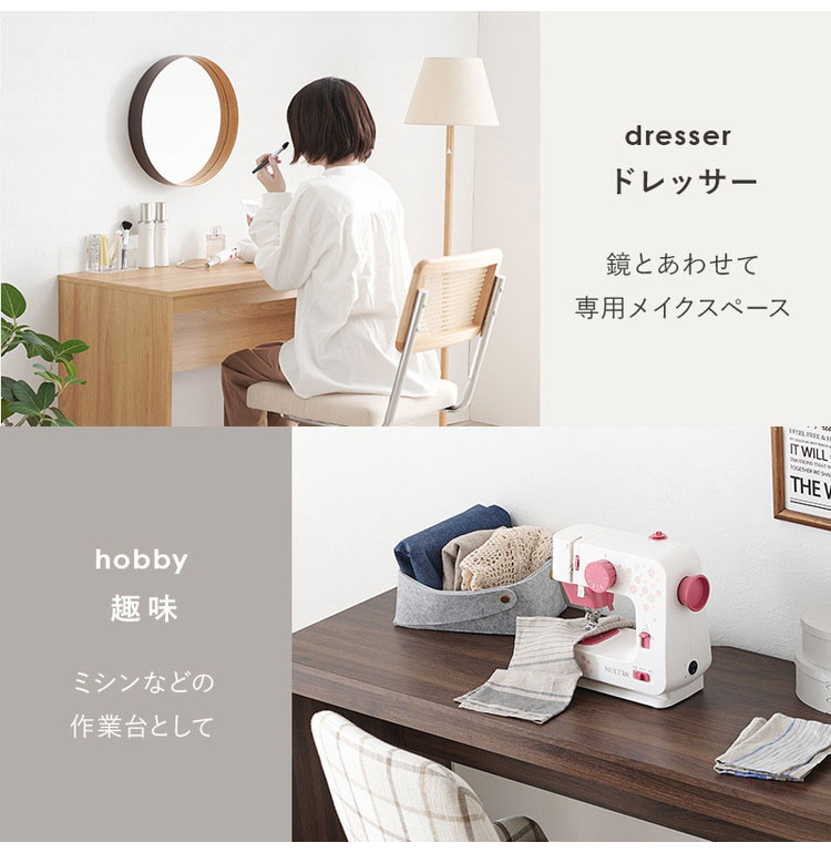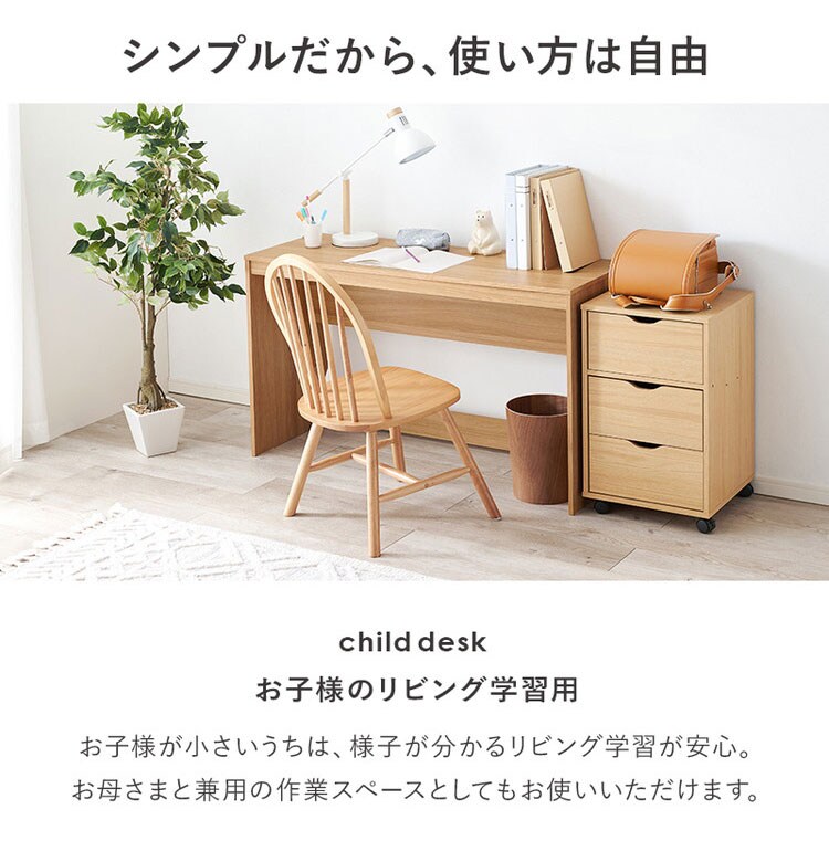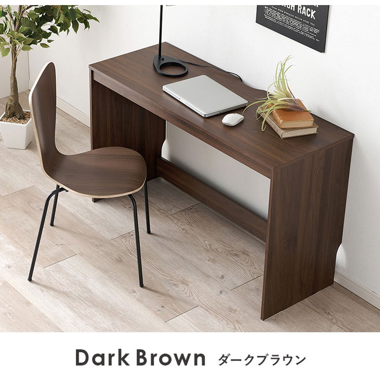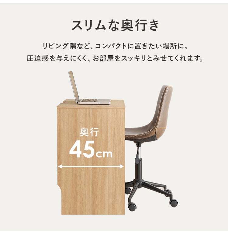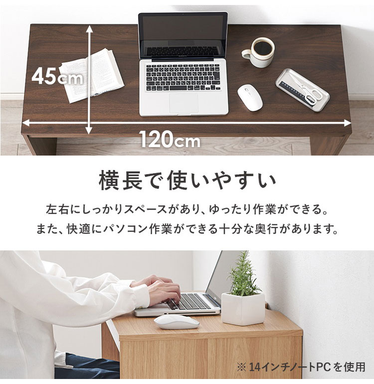 リビングの一角や狭いお部屋にも置きやすい奥行スリムなシンプルデスク。左右にスペースがありゆったり作業ができる幅120cmタイプ