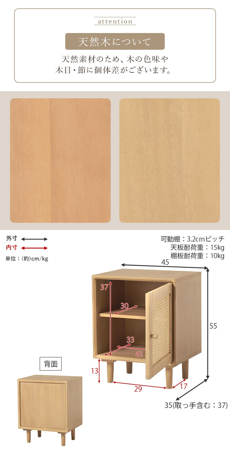 天然素材のラタンでかごめ編みを施した扉が、木のぬくもりに馴染みながら透け感を演出します。