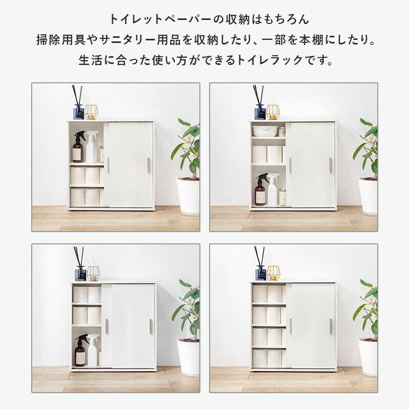 トイレットペーパーの収納はもちろん、掃除道具やサニタリー用品を隠して収納することも可能です。