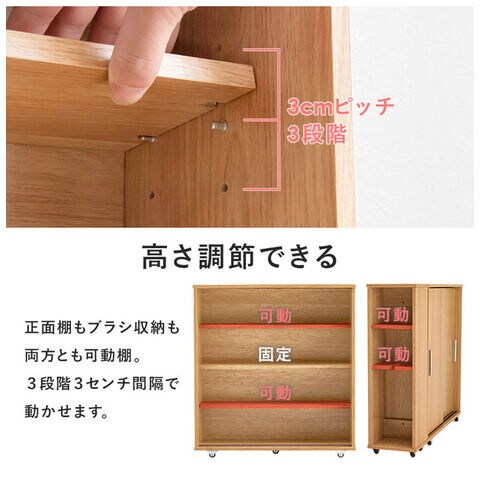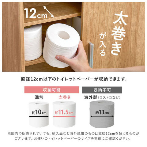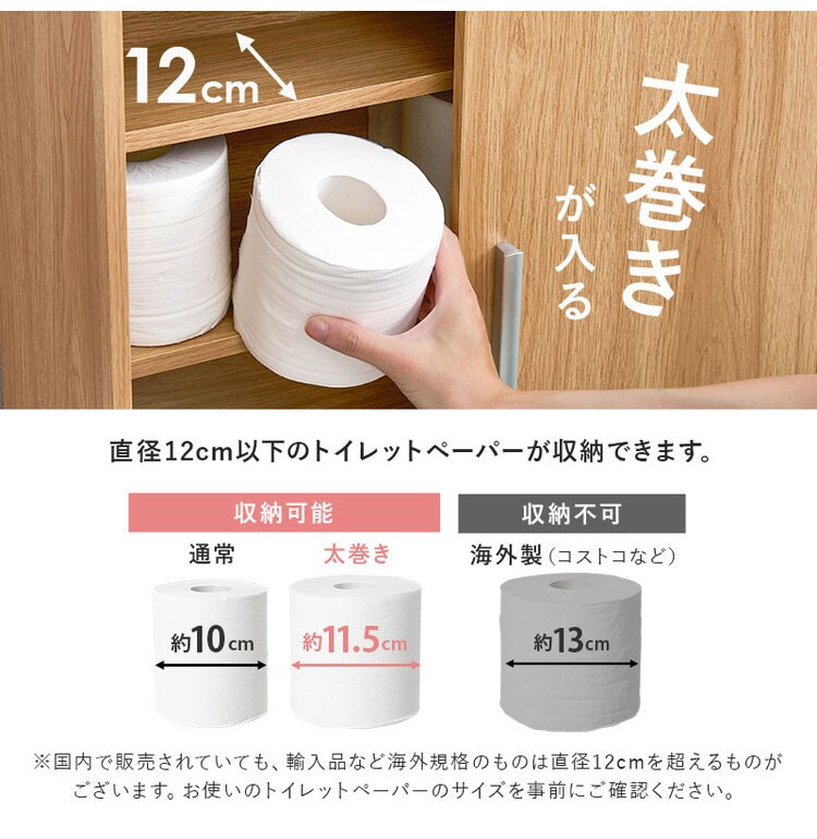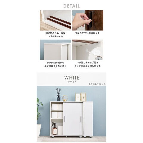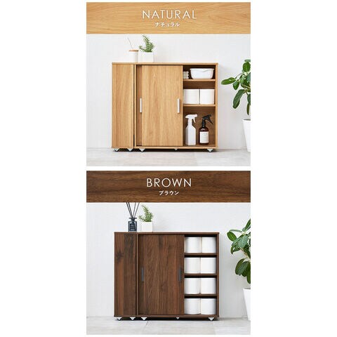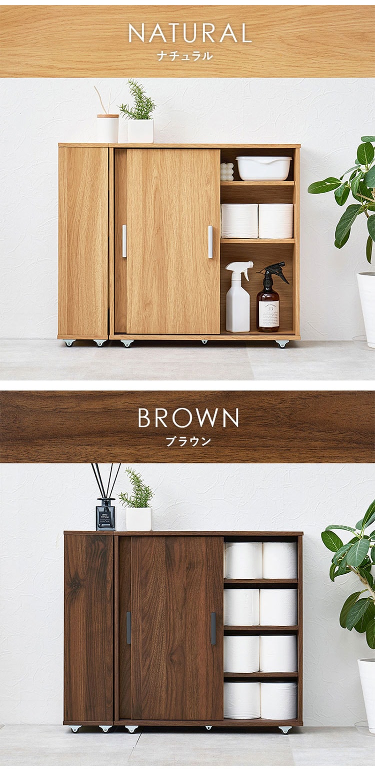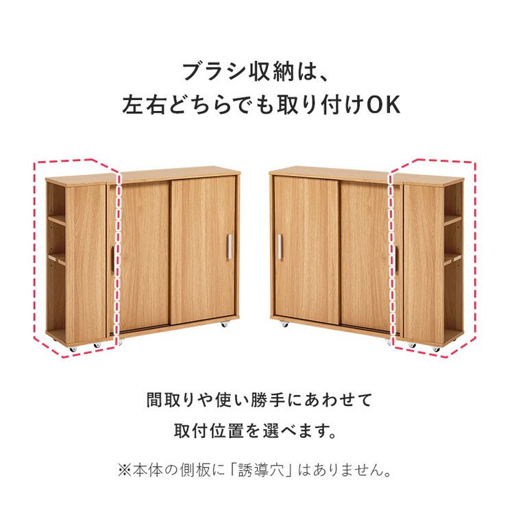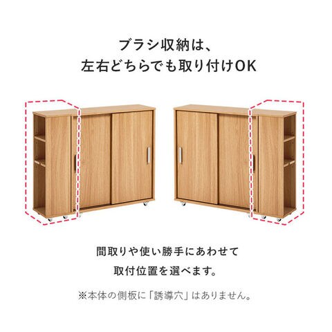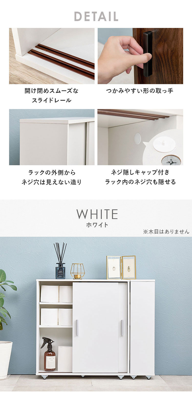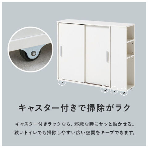 引き戸タイプなので省スペースなのに、大きめのペーパーロールも入る収納力。お掃除ブラシが収納できるサイドラックとキャスター付き