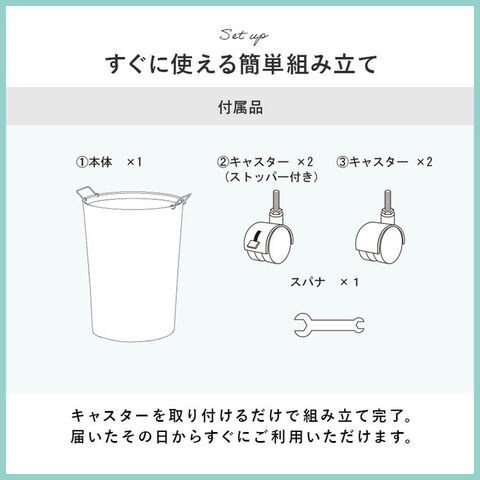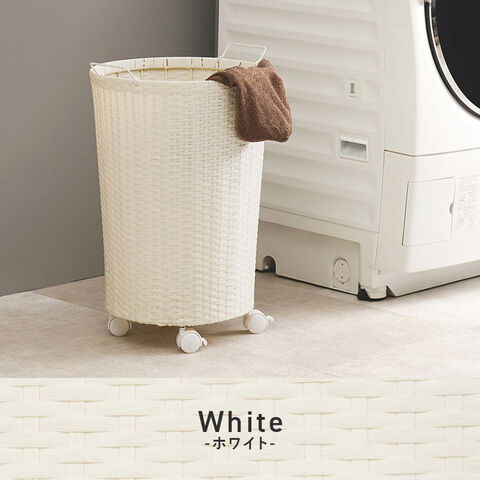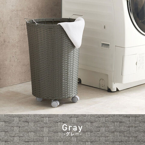 大口で放り込みやすい形状で、リビングにも溶け込むシンプルデザイン。キャスターが付いて移動しやすいので、水を含んだ重い洗濯物の移動や子供部屋の片付けに便利。
