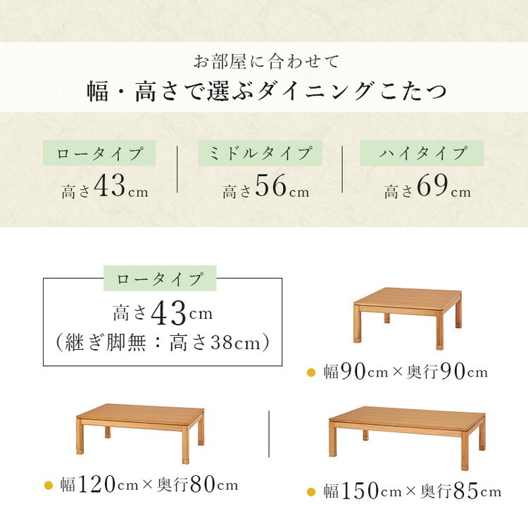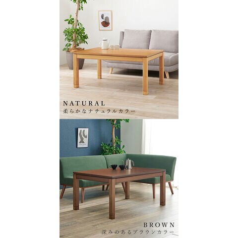 天然木のぬくもりを感じられるリビングこたつテーブル。5cmの継脚付きでソファや座椅子に合わせて高さを変えられます。