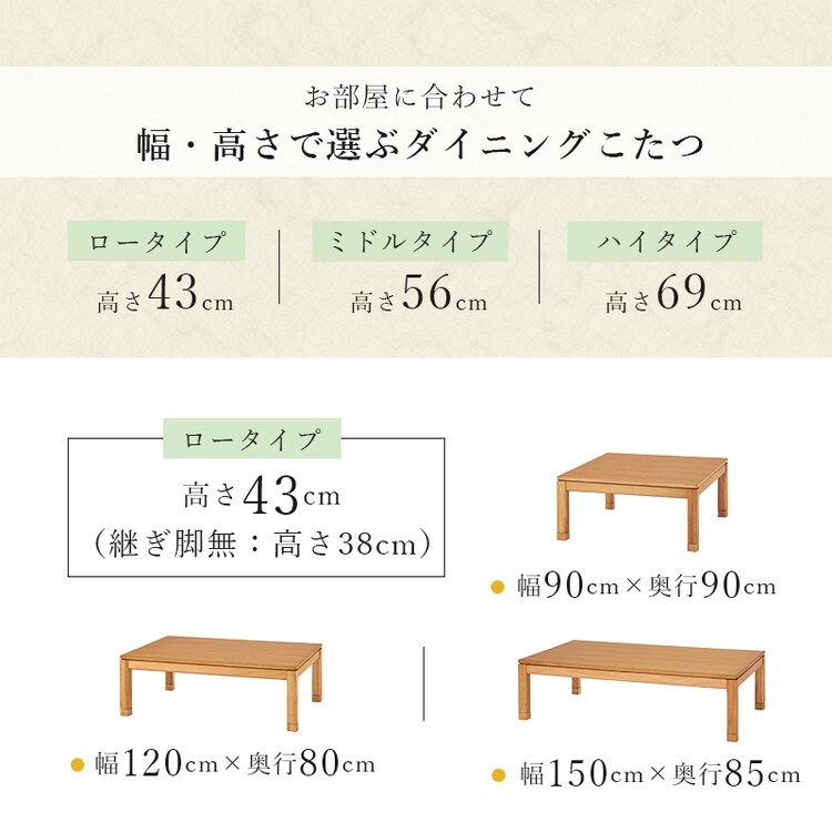 天然木のぬくもりを感じられるダイニングこたつテーブル。5cmの継脚付きで椅子に合わせて高さを変えられます。
