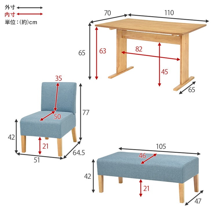 ベンチ:(約)幅105×奥行47×高さ42×座面高42cm