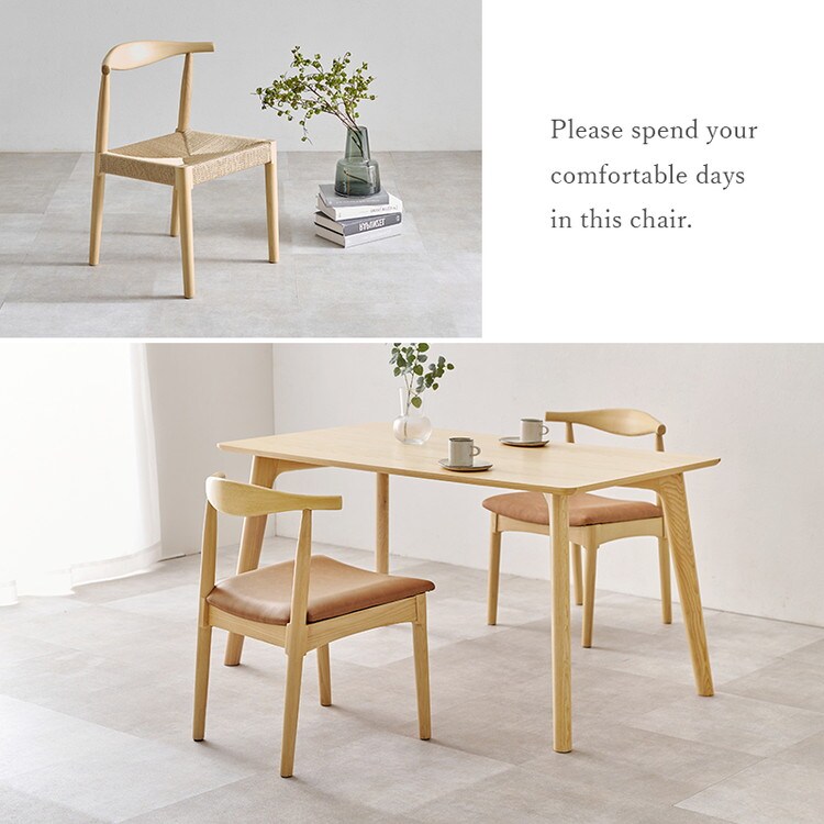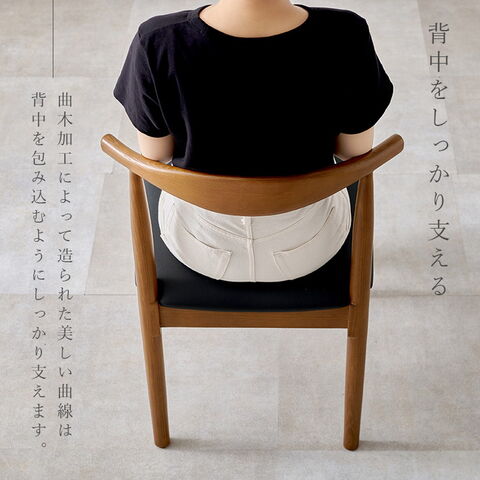 天然木の風合いが楽しめる木目が美しいダイニングチェア。背もたれの曲線が背中を包み込むようにしっかり支えます。
