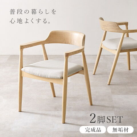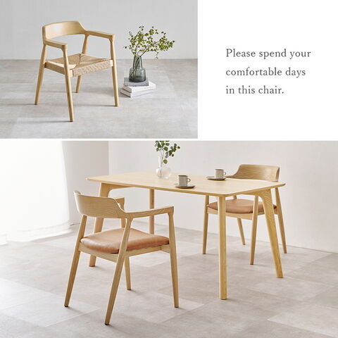 天然木の風合いが楽しめる木目が美しいダイニングチェア。背もたれと肘掛けが一体化したスッキリとしたデザインです。