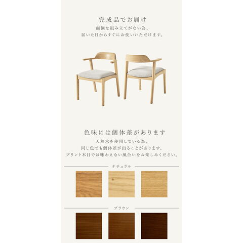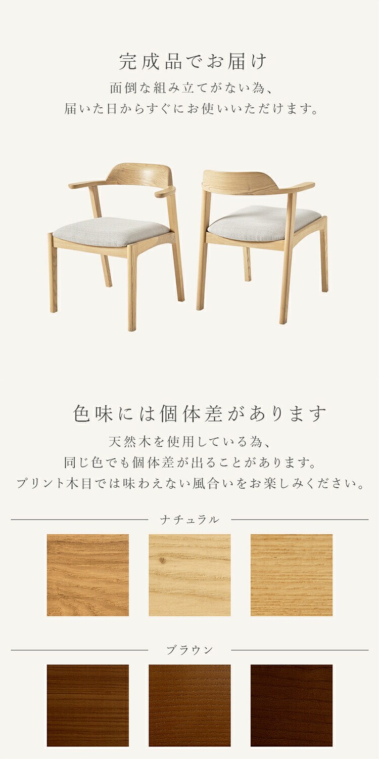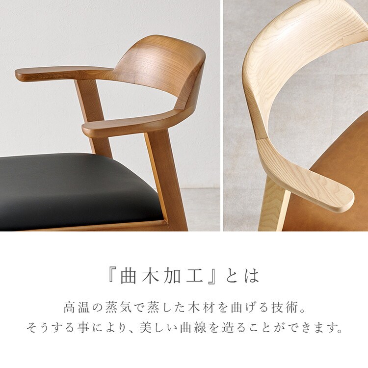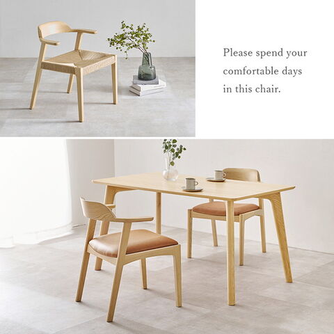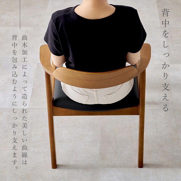 天然木の風合いが楽しめる木目が美しいダイニングチェア。肘掛け部分をテーブルに掛けられてお掃除に便利です。