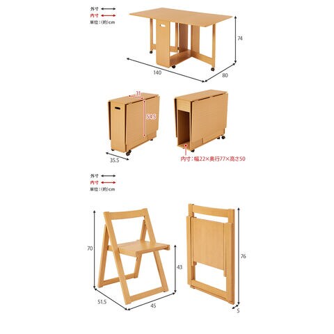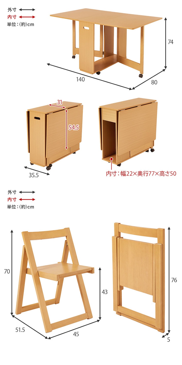 テーブル:(約)幅35.5/87.5/140×奥行80×高さ74cm、チェアー:(約)幅45×奥行51.5×高さ70×座面高43cm