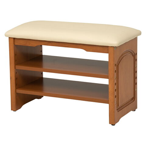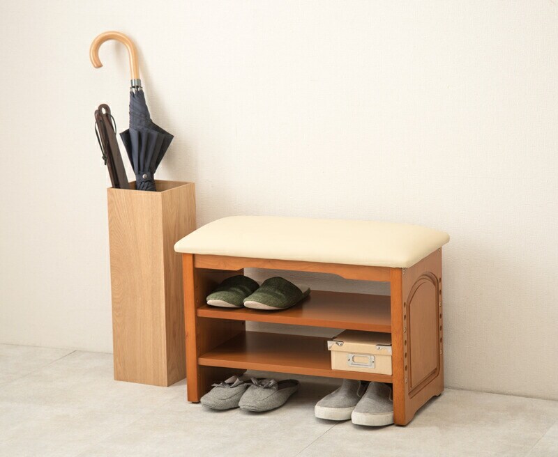 靴の脱ぎ履きに便利な玄関ベンチ。座面下は2段の棚で靴やスリッパの収納スペースになります。